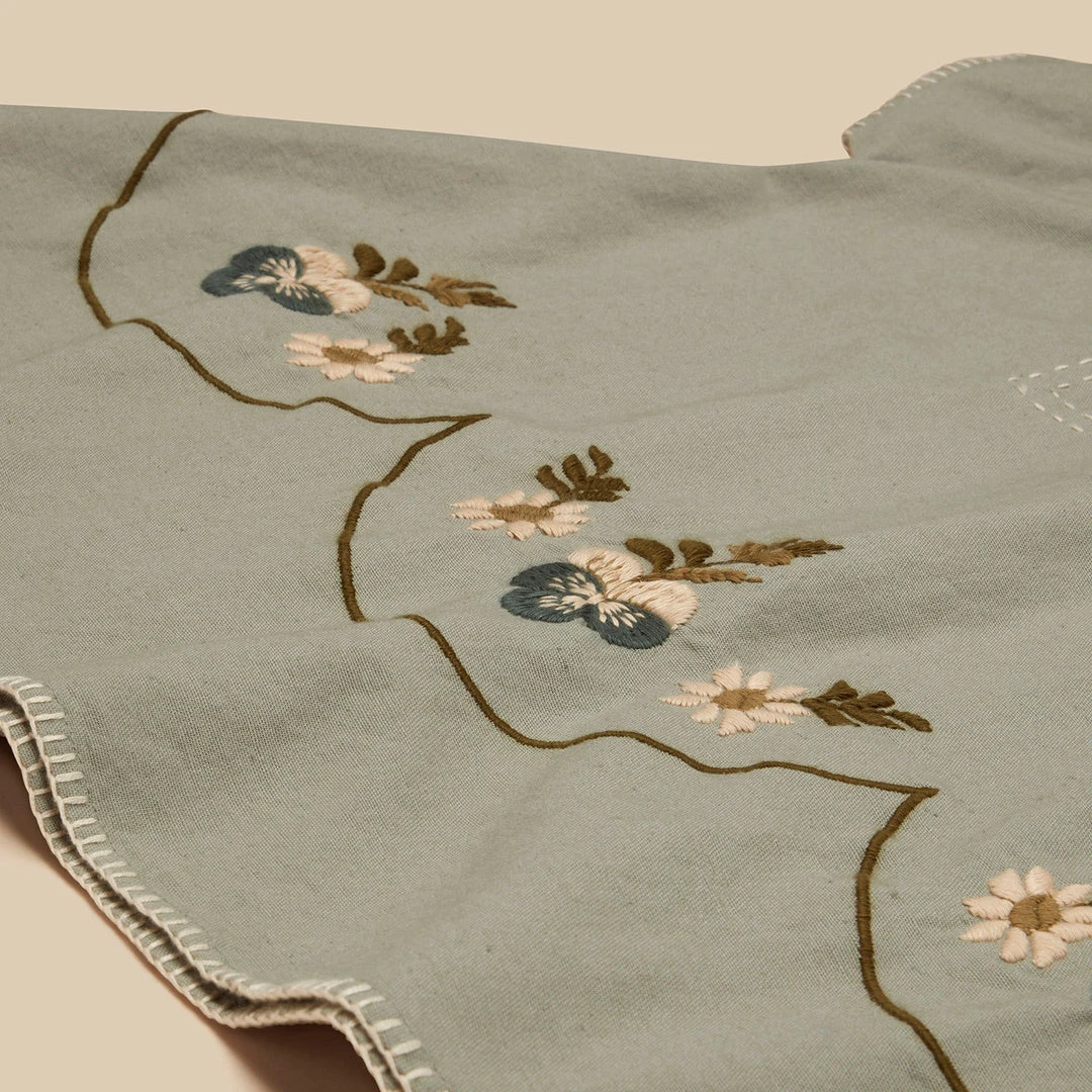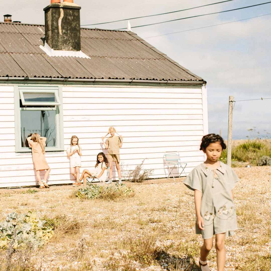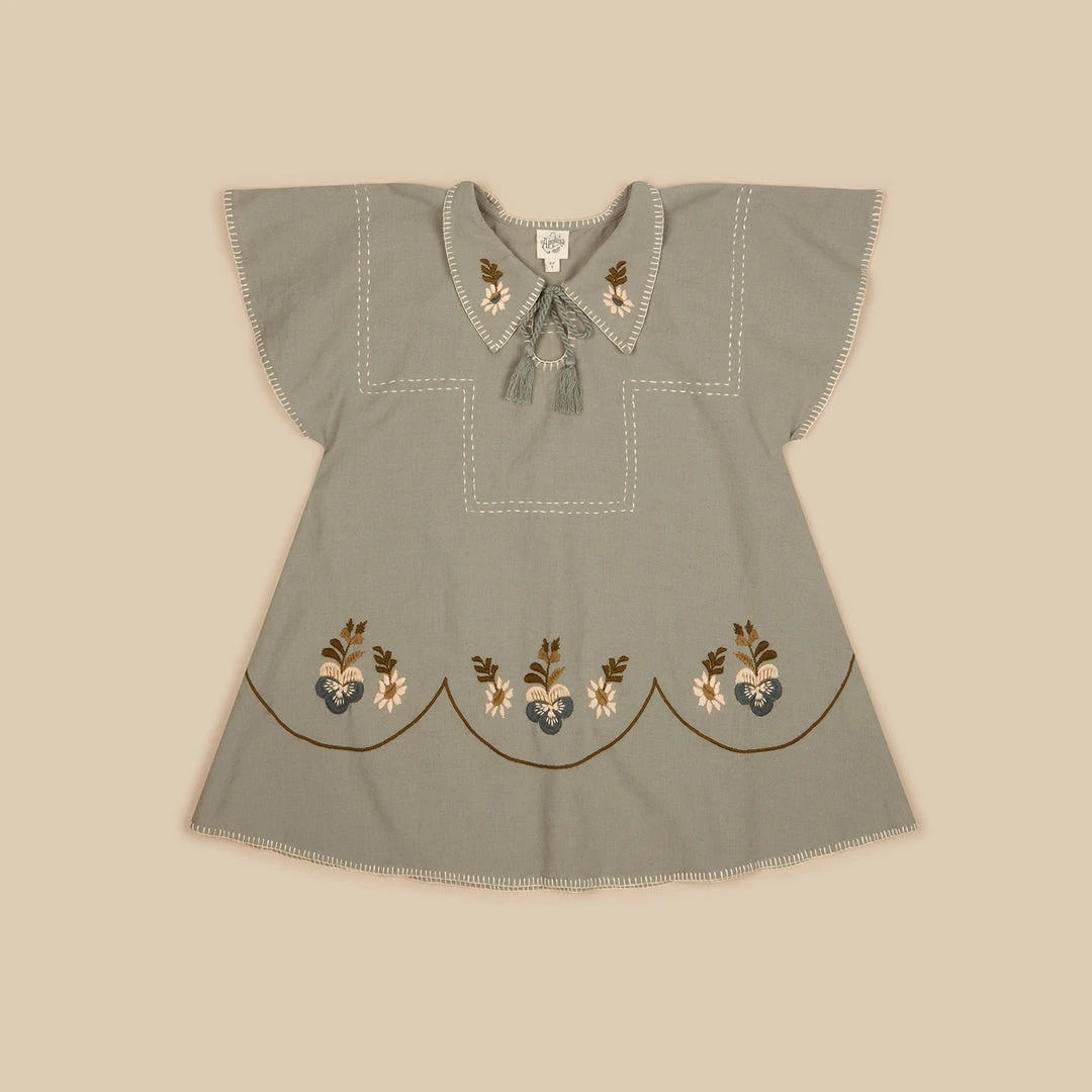 A new style kaftan dress, Konnie us an easy pull-on style with a relaxed fit. Made in ‘pebble’ cotton with the sweetest pansy embroideries in vintage-inspired tones. Features hand blanket stitch at collar, hem and cuffs, and a little tassel tie at neck. An ideal summer play dress, allows for easy movement. Hand wash recommended.
