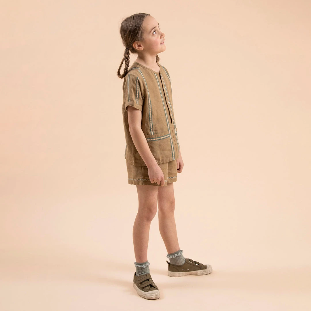 A sweet set for boys and girls. Elis comes in Apolina’s ‘bracken’ linen. Featuring a collarless button up shirt with pockets and linear embroideries, and pull-on shorts with embroideries around the legline. The perfect set for warmer days.