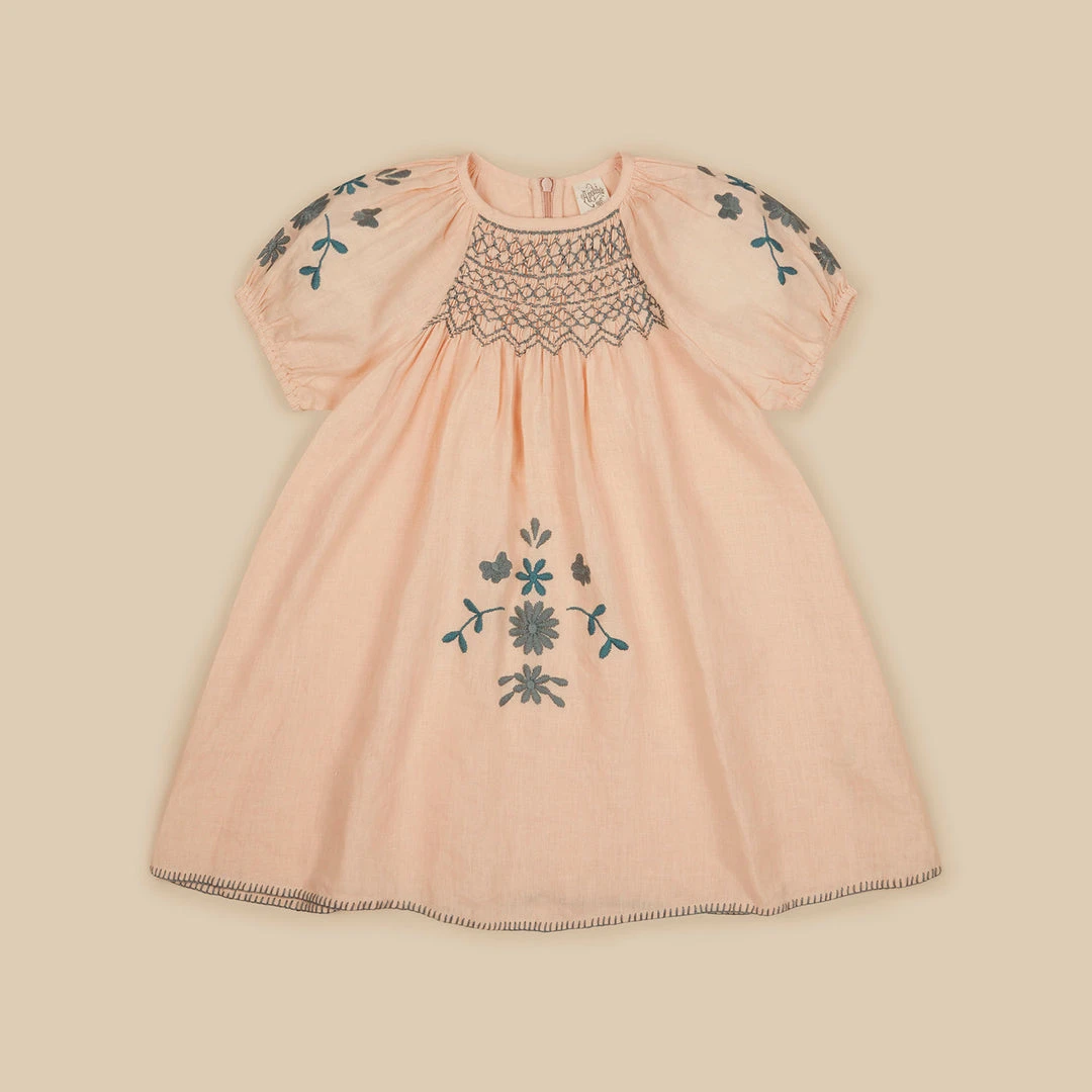 This new take on Apolina’s classic Maren dress comes in a soft ‘sweetpea’ linen. It is designed with dramatic puff sleeves with elasticated cuffs, hand smocking to chest and Maren’s signature naive bold embroidery to skirt and sleeve in multi-toned ‘pool’ shades. Featuring an invisible zip closure to back. Hand wash recommended.