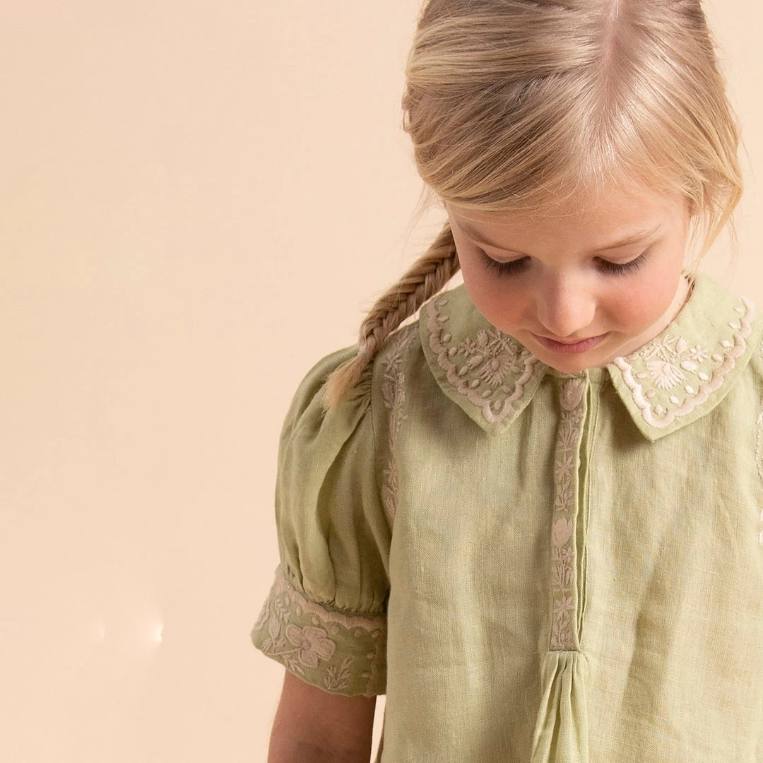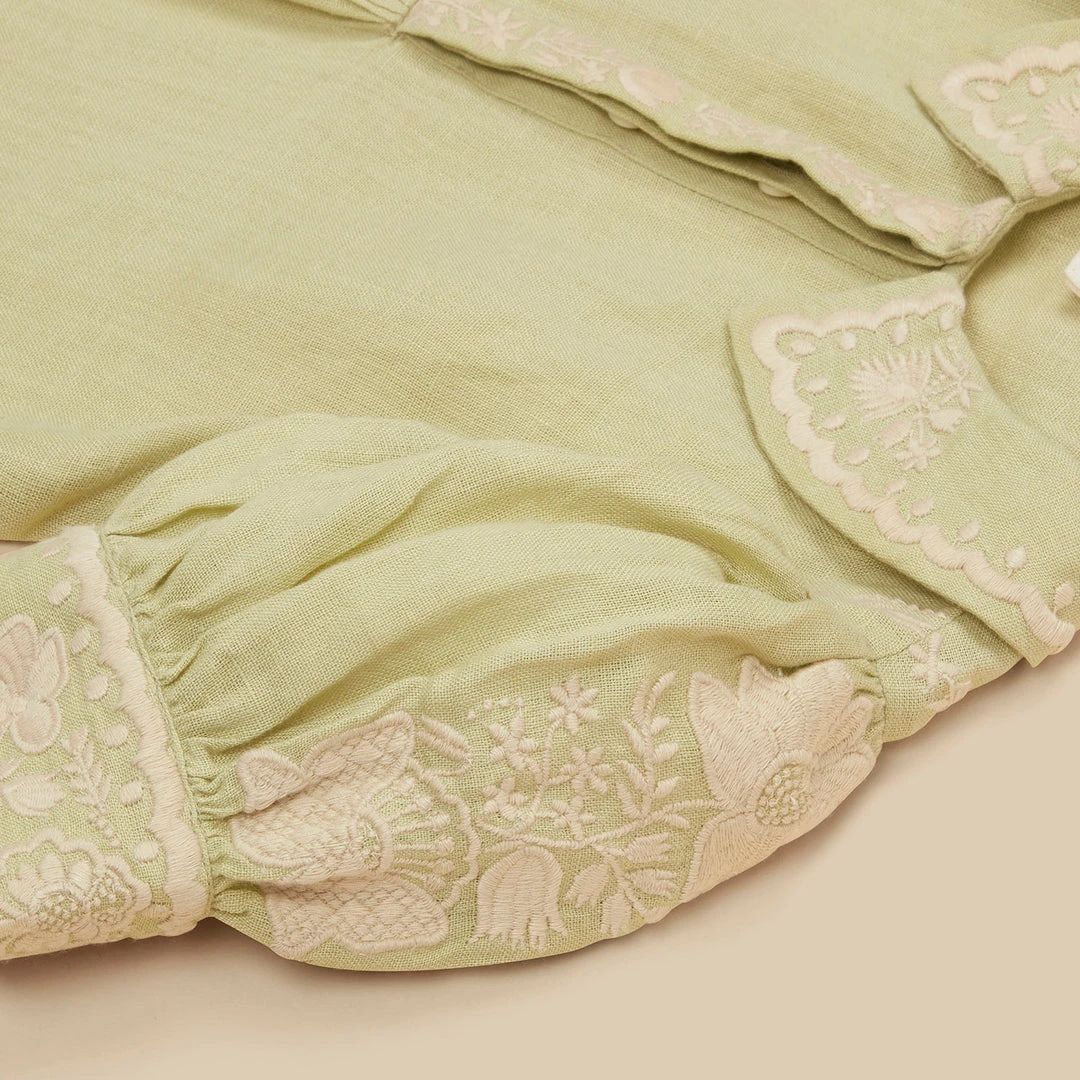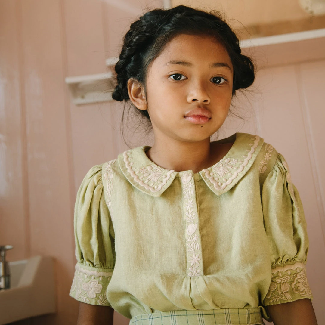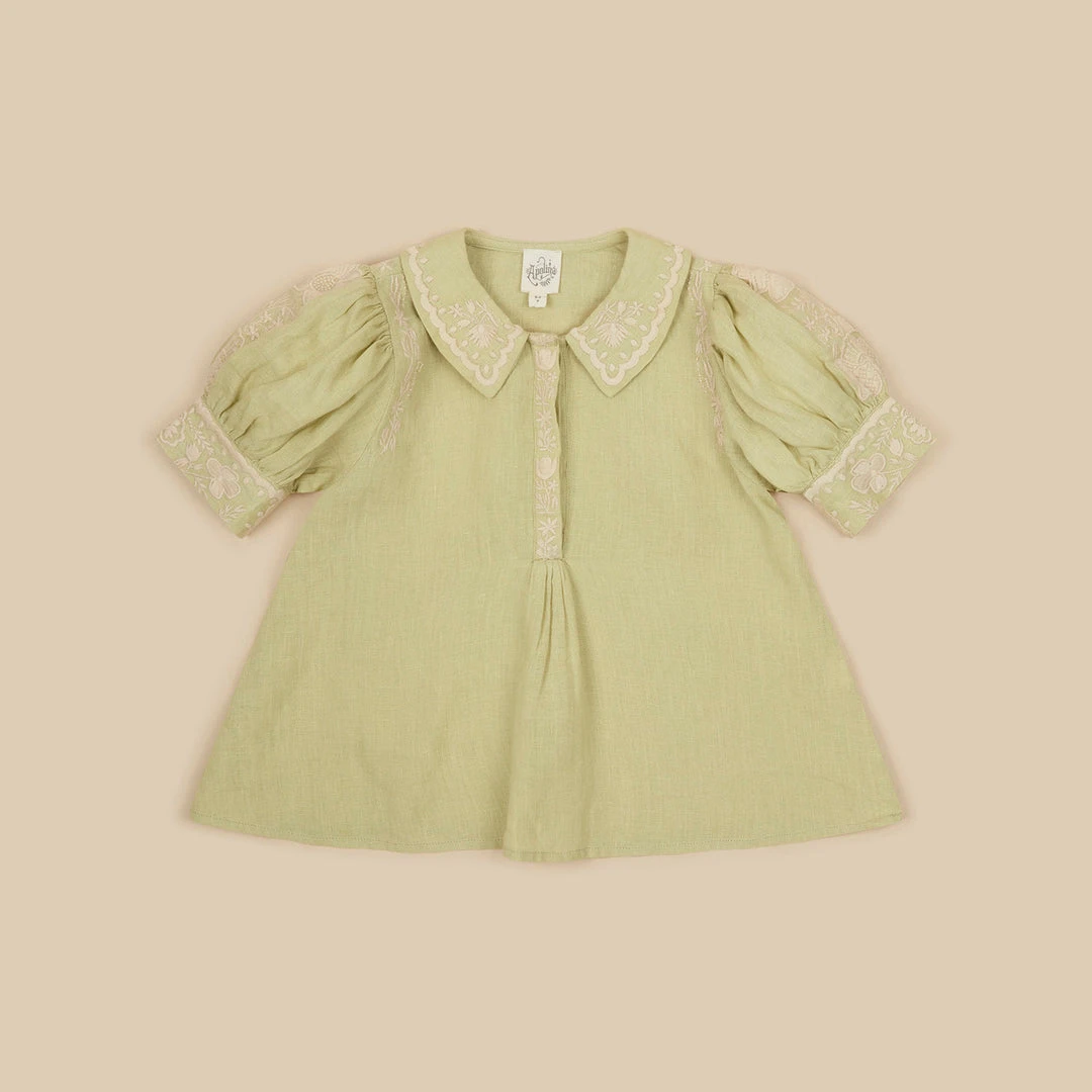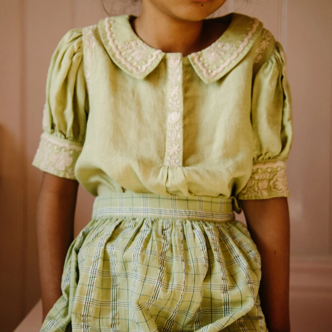 Hedda is a sweet A-line blouse in a 1950s-inspired ‘apple’ green. The blouse features gathered sleeves and a sweet collar with dramatic contrast embroidery. Button up placket to front. Perfect styled over a pair of shorts or leggings. Hand wash recommended.