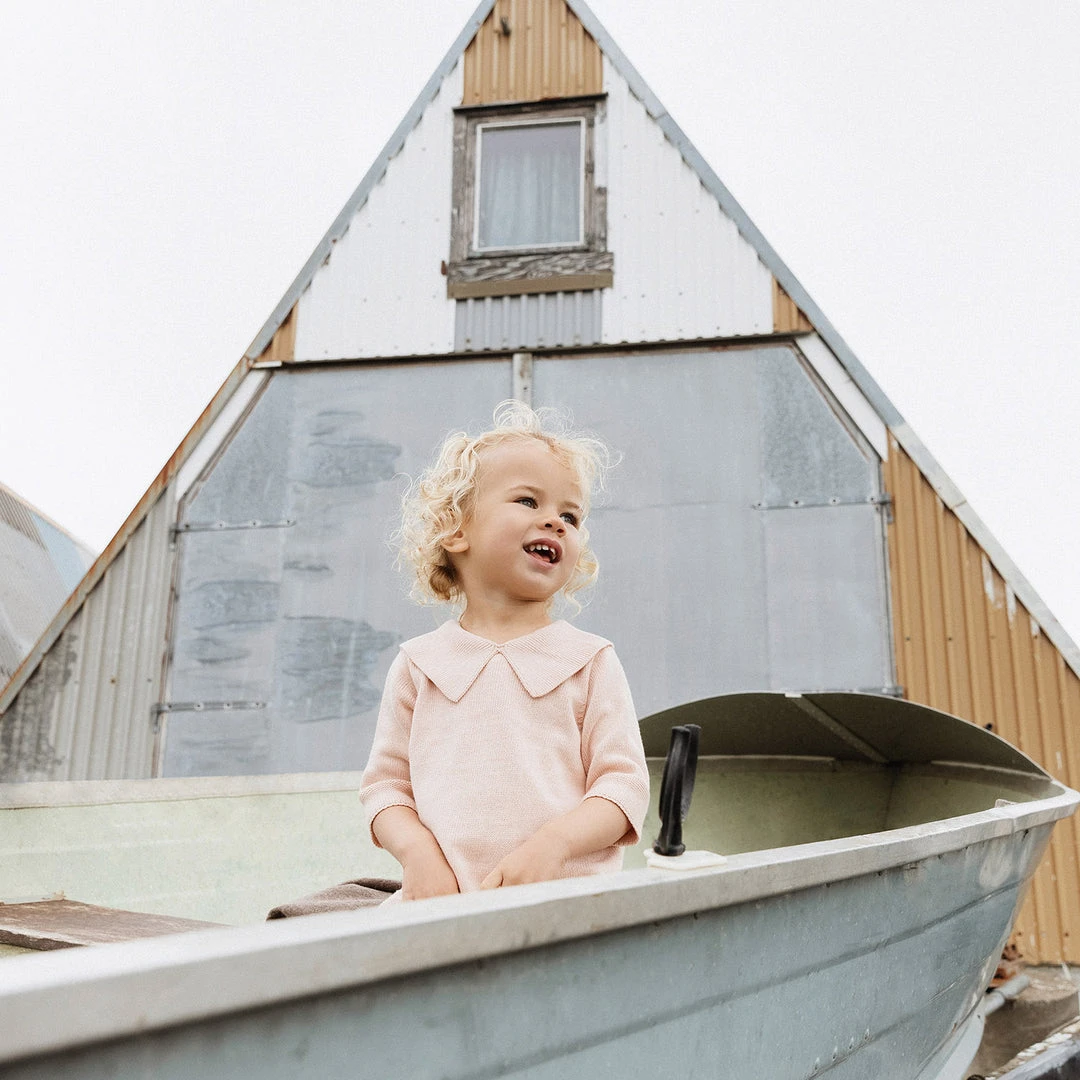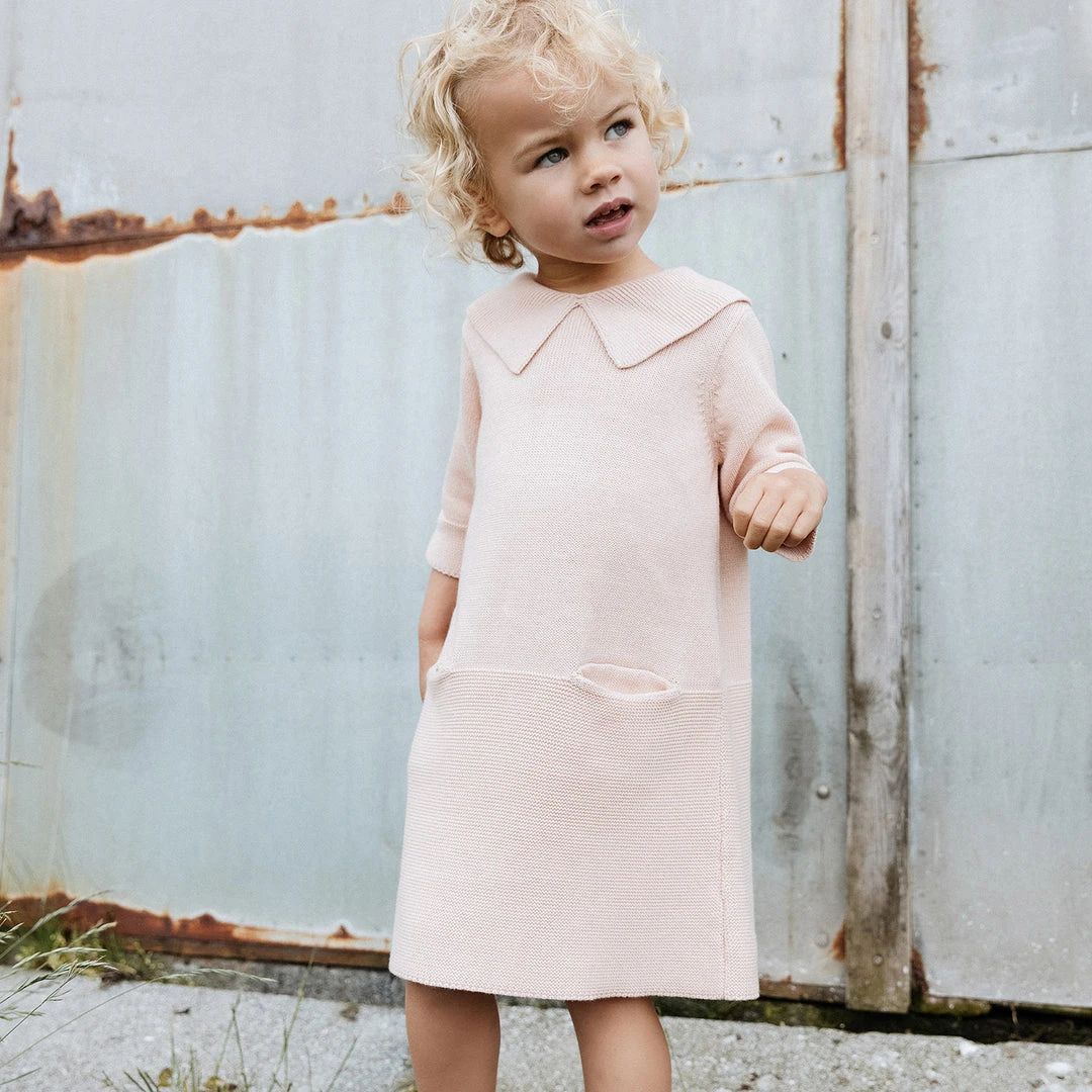 Knitted sister dress in cotton, perfect for summer. Features a sweet collar and two front pockets. Can be layered when needed and worn all year round.