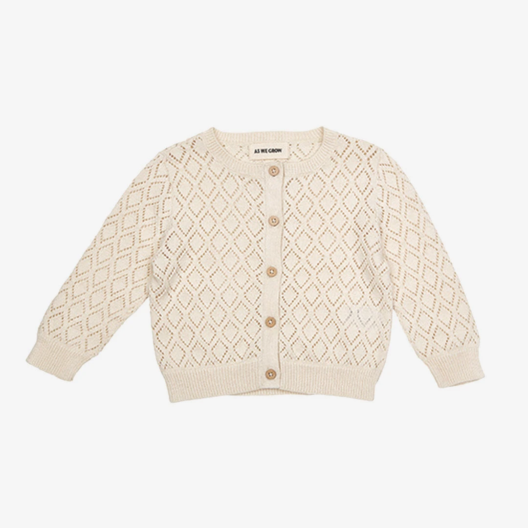 A classic As We Grow diamond cardigan. Knitted in a soft pointelle pattern. Perfect for all year round. Timeless piece.