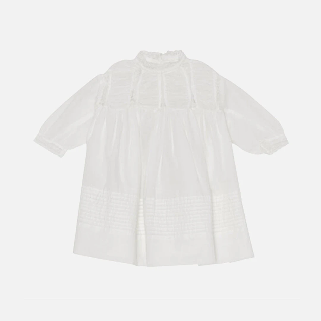 The Geraldine dress has a vintage feel. It is entirely handmade, all the the small pleats detailing are made by hand. Perfect dress all year round and can be layered when needed with tights and a cardigan.