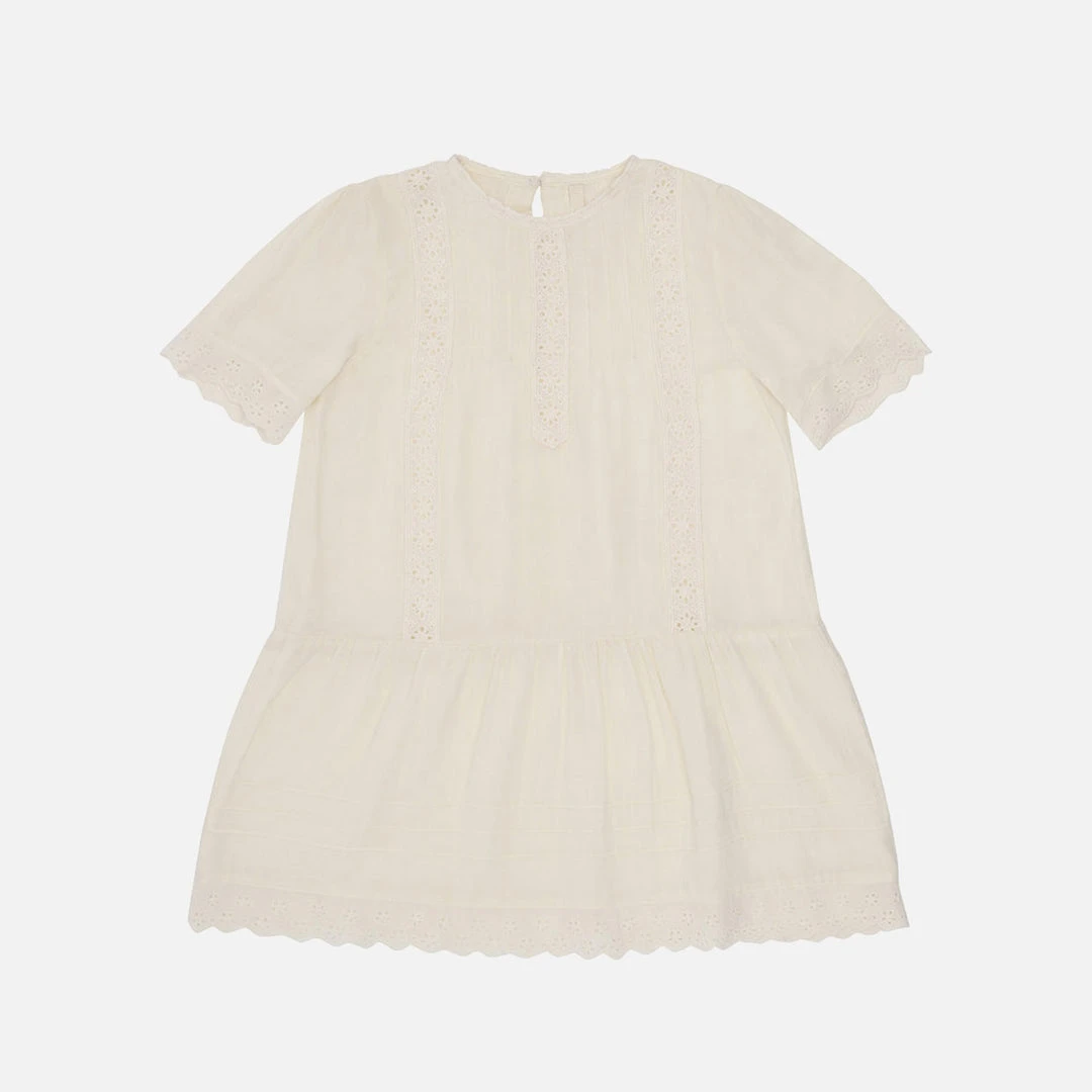 A sweet lightweight short sleeve dress with Broderie Anglaise detailing. Buttons at the back for ease of dressing. This dress makes a great summer dress and is perfect for special occasions.