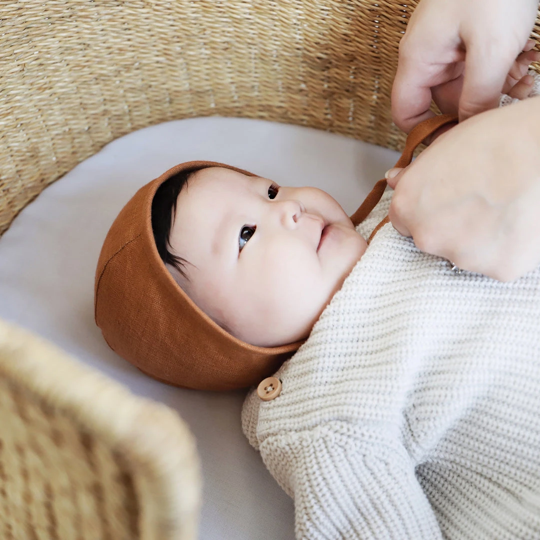 Compliment their bright eyes and blush cheeks with this medium weight bonnet in a rust Linen mix, specially made to keep them comfortable and covered.