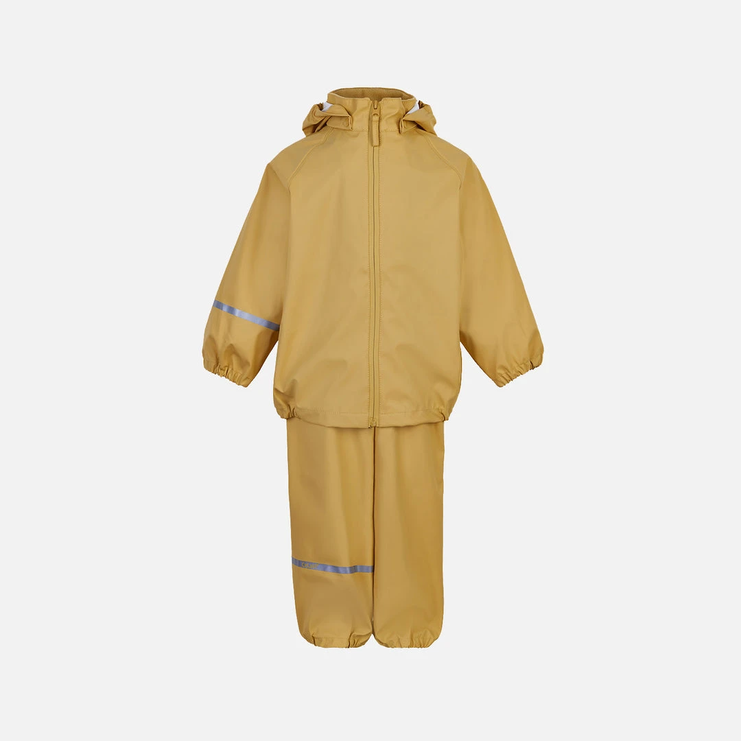 These classic rainwear sets are great for everyday play. Made from Recycled PU from 100% recycled polyester remelted from plastic bottles.  Simple, soft, flexible and lightweight rainwear.
