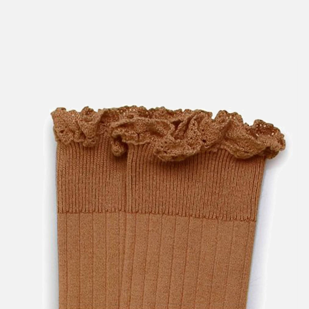Comfortable, classic long socks in Old Rose with new cotton lace detail at the top. These socks are knitted using a blend of 84% egyptian cotton, 14% polyamide and 2% lycra/elastane for excellent elasticity.Â