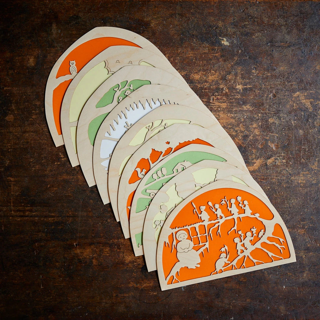 The silhouette scenes are interchangeable, and they are wonderful pieces to collect over time. They can be chosen to honour seasonal change, represent special occasions (such as birthdays, Christmas or Easter) or used as a story telling prompt.Â