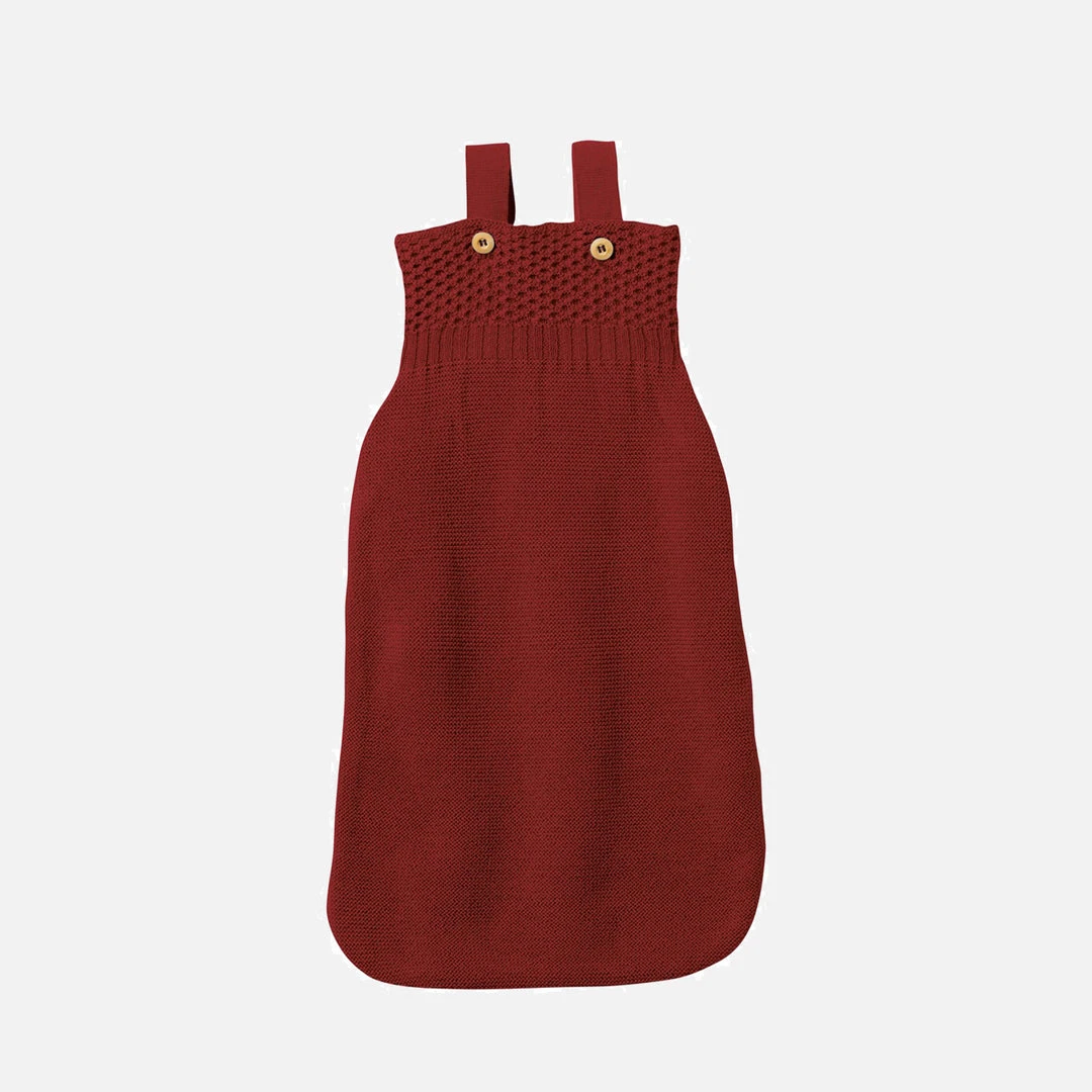 In the new colour Bordeaux the beautiful and classic Disana knitted sleeping bag is unlike other sleeping bags. It is made with the finest merino wool. The high, stretchy knitted waistband gently embraces the child without pinching, while the wide leg bag leaves space for baby to wriggle about. Two wide knitted straps keep everything in place. The sleeping bag design keeps baby well wrapped up and warm even when she has trouble sleeping.