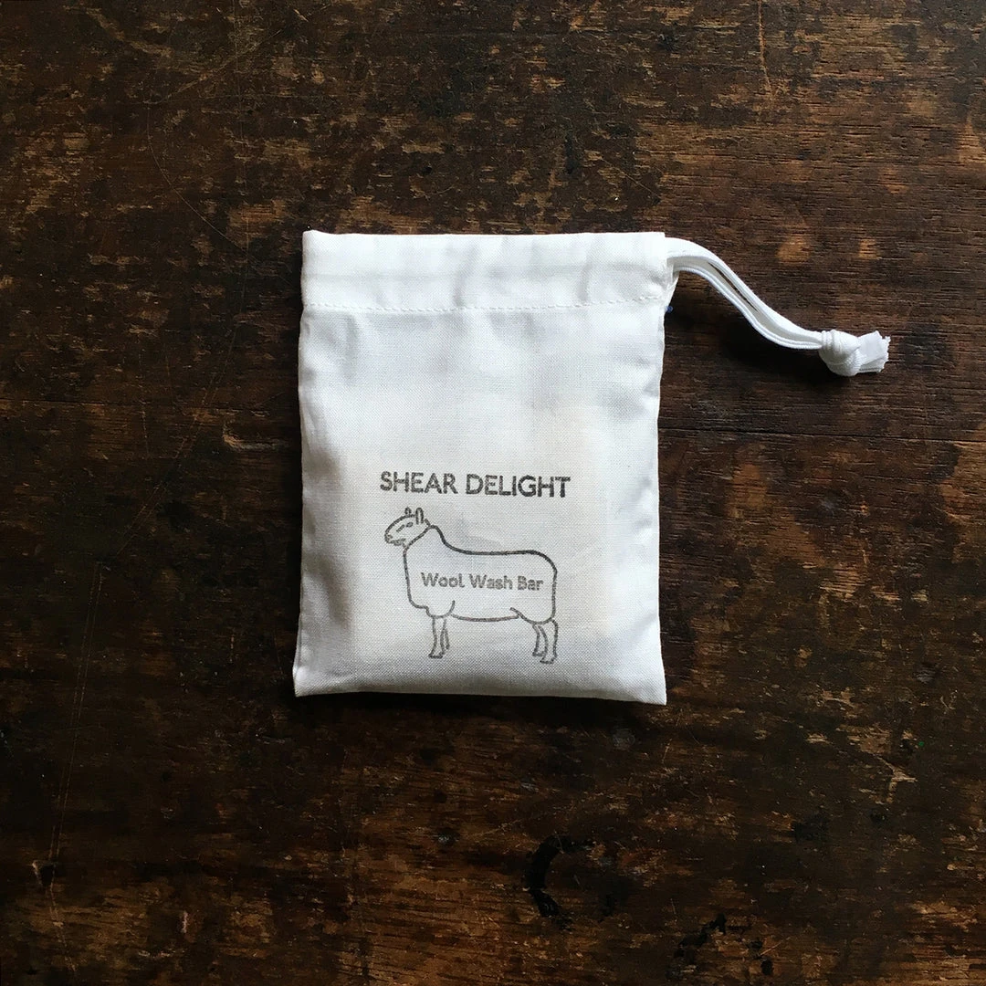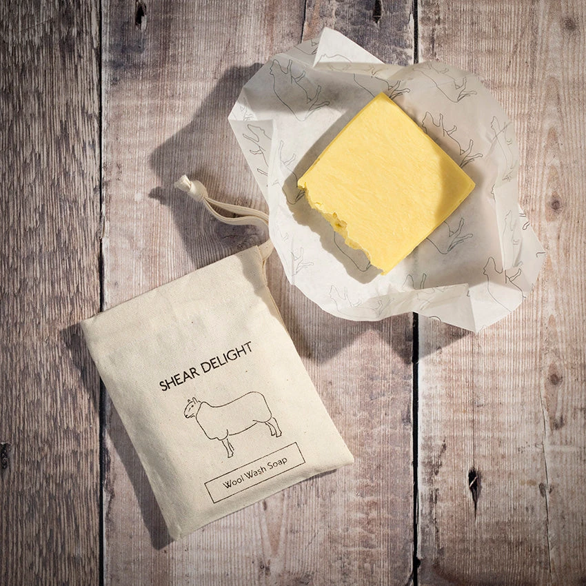 This wool wash bar contains milk and lanolin. Each bar is wrapped in greaseproof paper and come in a handprinted canvas bag, with product use instructions inside. The bags can be kept and reused and the greaseproof paper recycled or composted.
