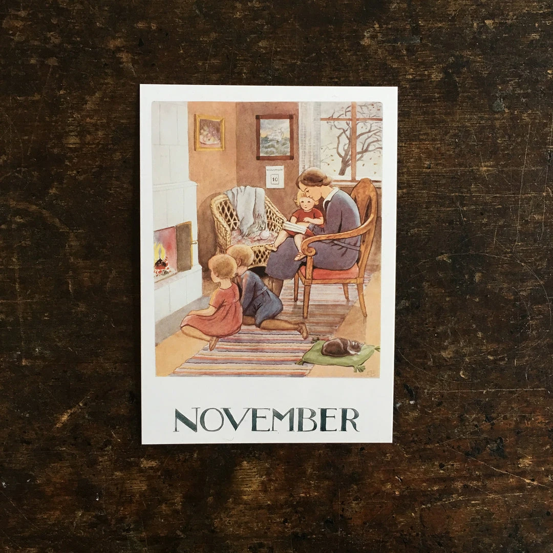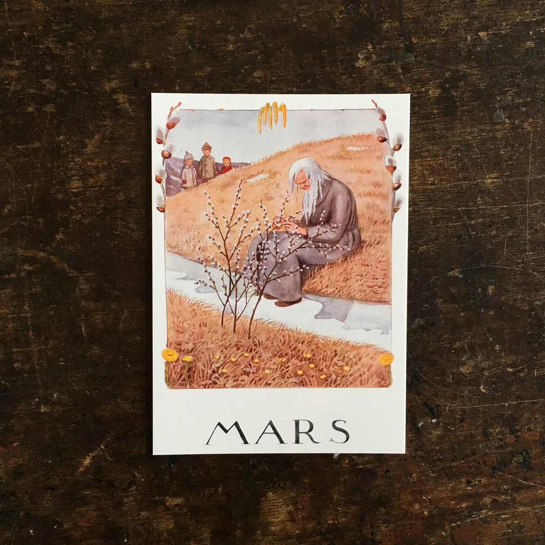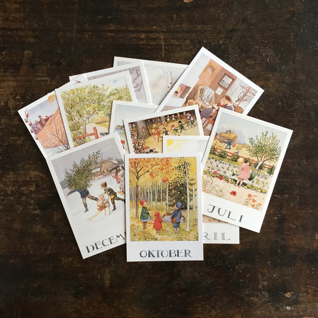 Swedish children’s author and illustrator, Elsa Beskow’s early 20th Century drawings printed as postcards for each month of the year. Sold individually by month.
