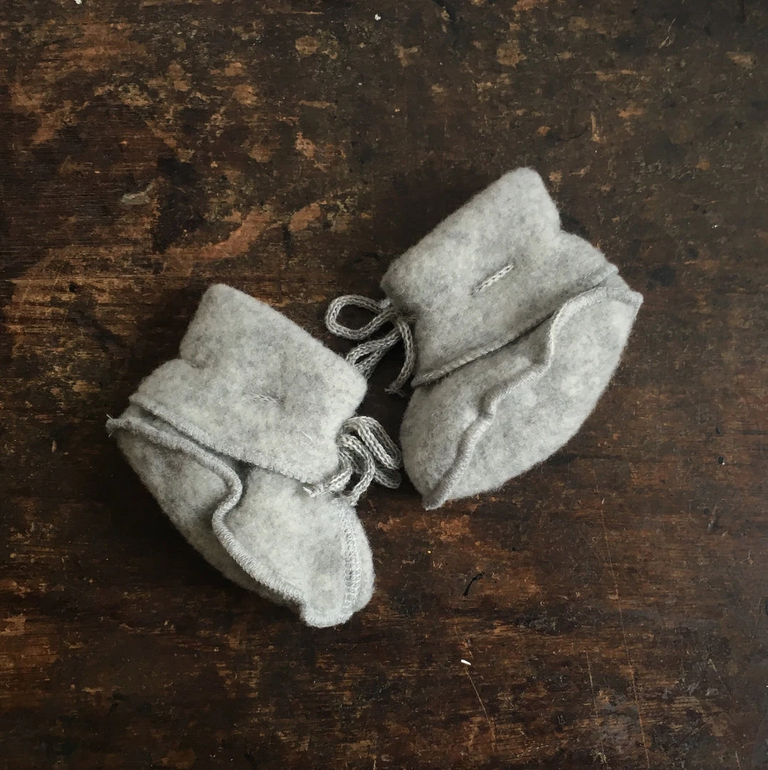 Incredibly comfy, soft and warm wool fleece. The perfect first booties with cord tie to fasten.