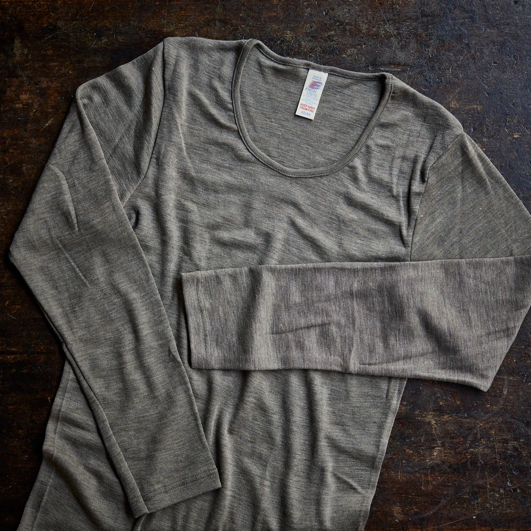 This wool/silk long-sleeve top is designed to be worn under clothing as a base layer, and sit at the wrist/mid-hip respectively. If you want a longer thermal (in both sleeve and length) see our exclusive colours (rust, ochre, rosewood and hazelnut).