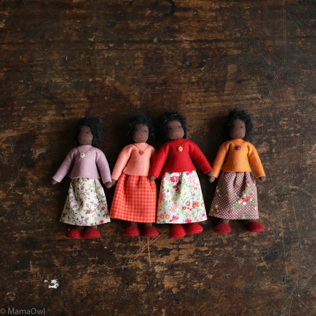 Flexible Dolls house dolls, perfect for playing with alongside all types of toys. Each doll is unique and is made using scraps of material from production waste. As each doll is different, the item you receive may not be reflected in the images here. Dolls are picked at random and we do not have images of all the different clothing colour options as these change with every delivery.