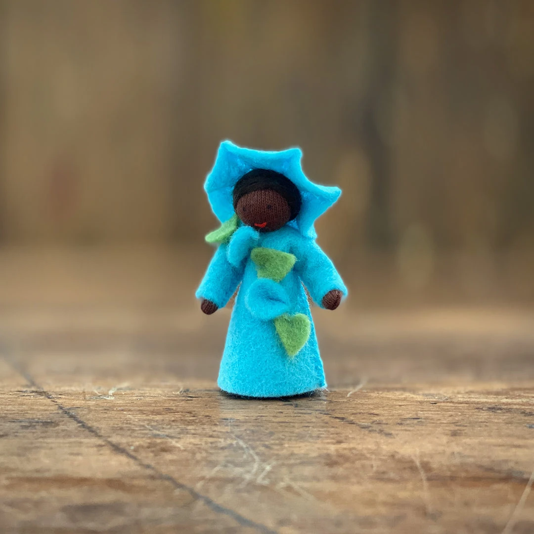 Little handmade flower fairies, made of wool felt and crafted in Romania. Summer flower Blue Morning Glory.