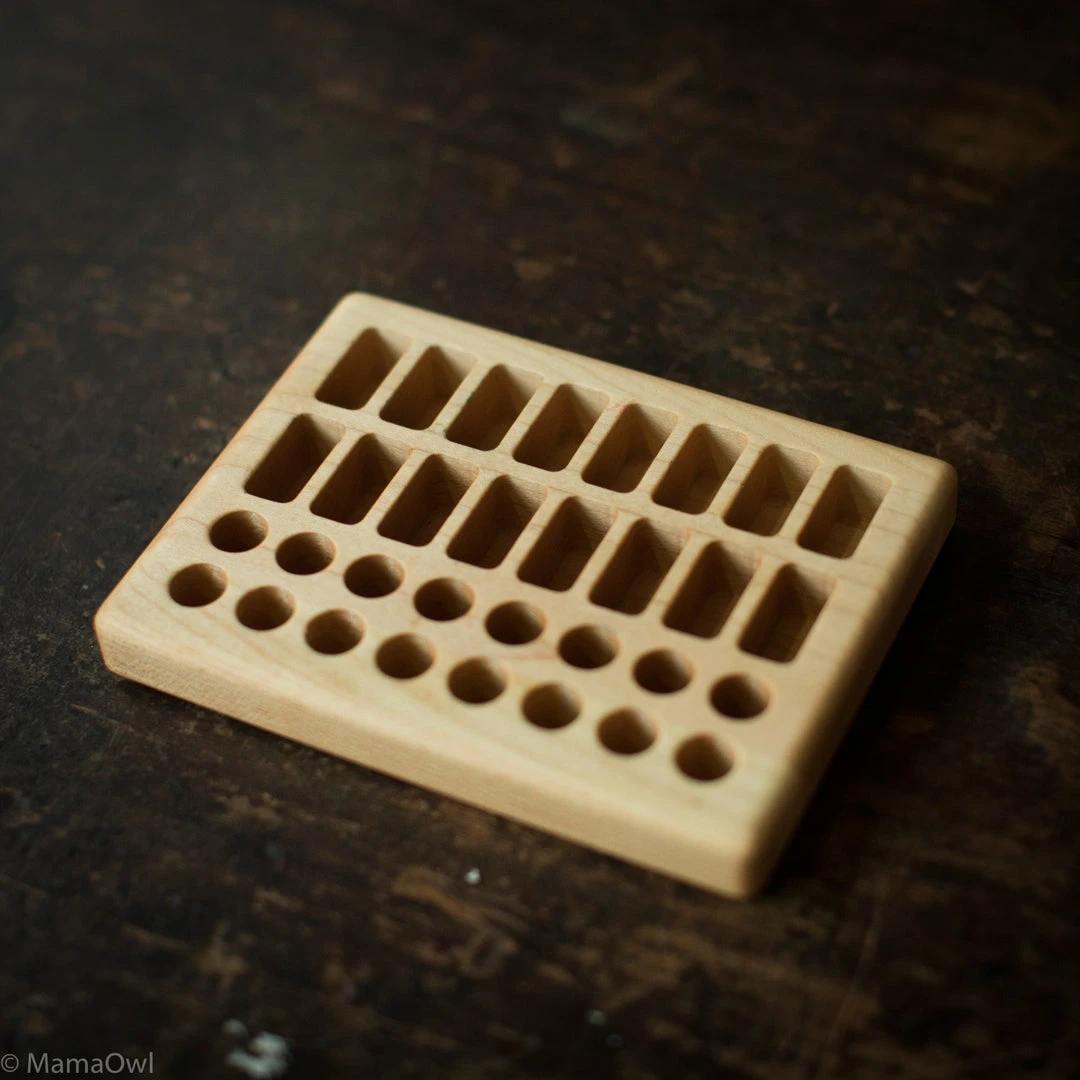 This Maple Wood holder keeps your crayons all neat and tidy and clean. It houses 16 beeswax block and 16 stick crayons, each in their own hole. The holes are sized to fit Stockmar.
