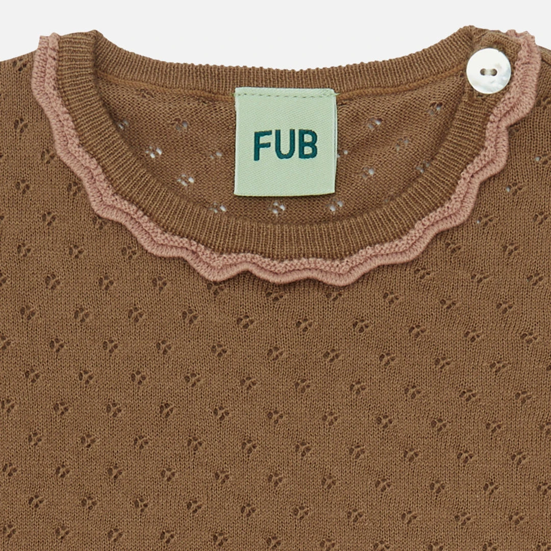 Body with practical button closure at shoulder with real pearl shell buttons and snap fasteners at the crotch. Knitted in a delicate pointelle pattern with knitted lace detail at neckline.