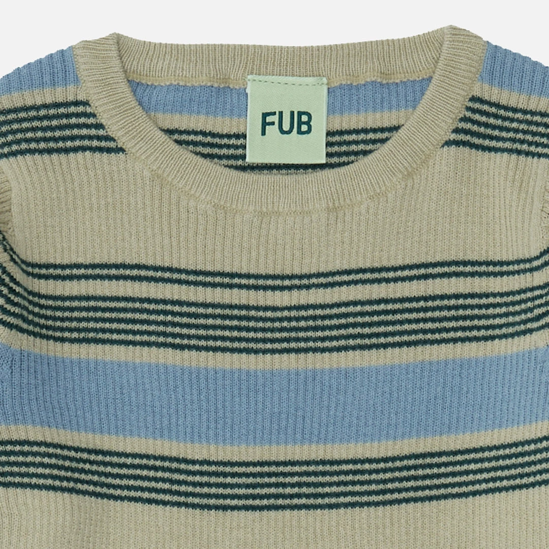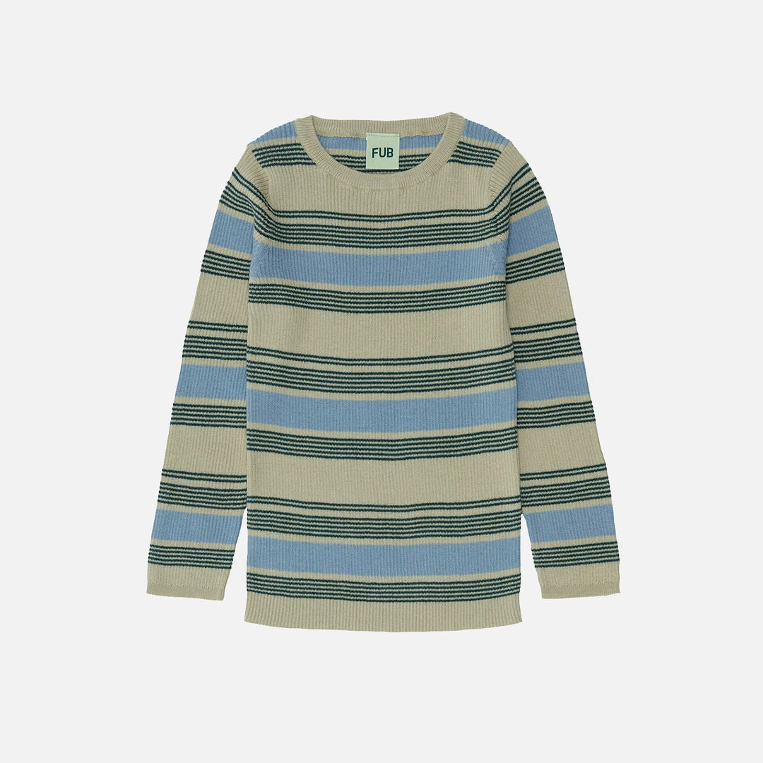 Long sleeve top with a round rib trimmed neckline and clean self-edges at end of sleeves and bottom hemline. Knitted in an extra fin rib structure with a slim fit. This top is knitted in a two-toned stripe pattern.