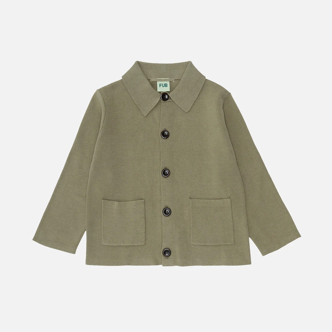 Summer jacket with a flat shirt collar, corozo button closure at front and front patch pockets. Featuring a loose fit and clean self-edges at bottom hem. Knitted in a firm Milano stitch for a clean and sharp appearance.