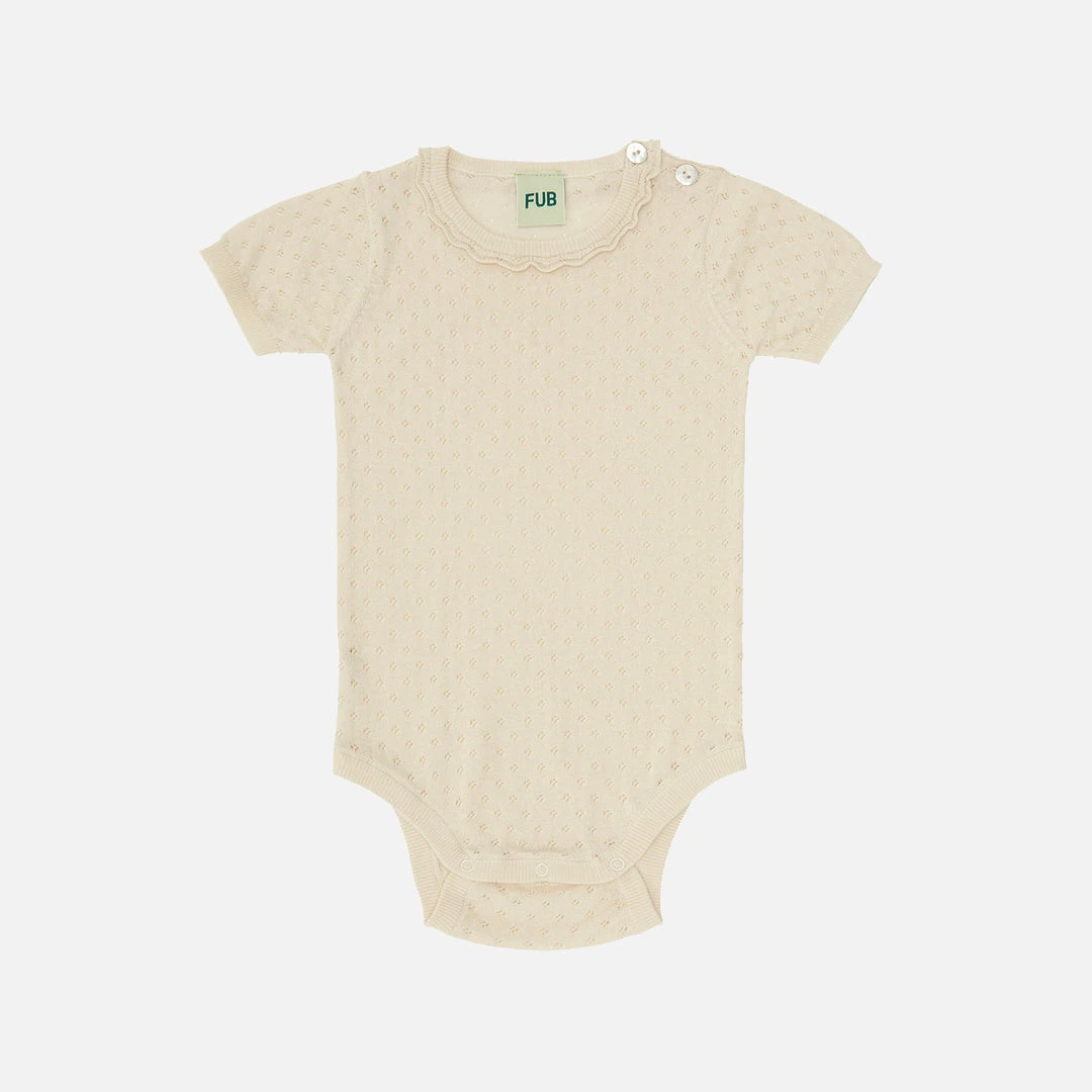 Body with practical button closure at shoulder with real pearl shell buttons and snap fasteners at the crotch. Knitted in a delicate pointelle pattern with knitted lace detail at neckline.