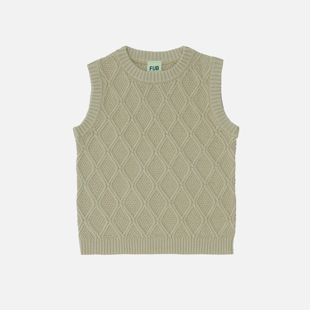 Knitted in a structure harlequin pattern. Features a regular fit, round neckline and rib trims at armholes and bottom hemline. This vest is suitable for layering or to be worn on its own. Lightweight and perfect for summer.