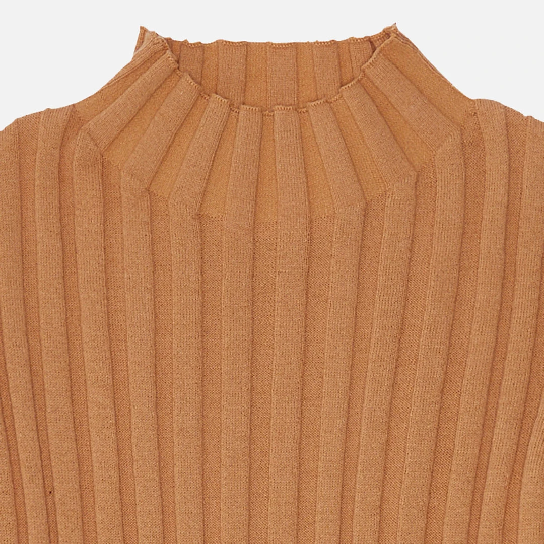 Long sleeve top with a straight slim fit. Knitted in extra fine rib. Features a high neckline and clean selvedge. Perfect weight for summer.
