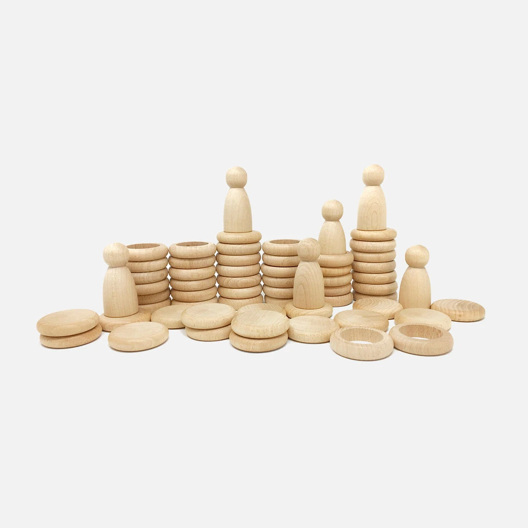This set contains 6 ‘Nins’, 36 rings and 6 coins in Natural Wood. The six rings allow to completely hide the Nin. The coins set the limit to make it rise, cover half of it, cover it completely… I appear, I disappear, I cover myself, I find myself again, etc. This is a simple material and allows many possibilities of play..