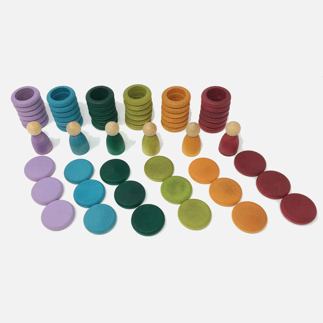 It contains 6 ‘Nins’, 36 rings and 6 coins in the colors of the rainbow.