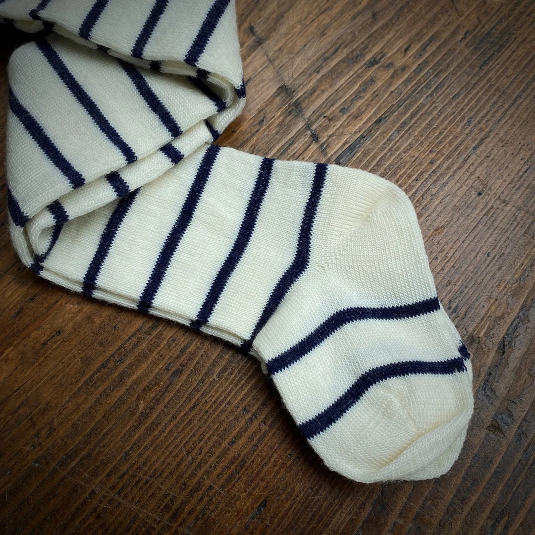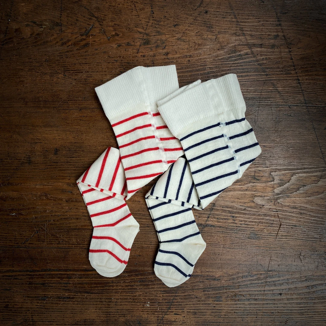 The much loved striped tights are back! Lightweight but warm and perfect for babies, in a sweet but classic stripe. These tights are perfect under trousers, as a base layer as well as worn with rompers and dresses as a bit of a statement. They stay up and are breathable, comfortable and non toxic. There is nothing better to keep a little baby warm than tights. They can’t fall off and leave no marks on little feet.