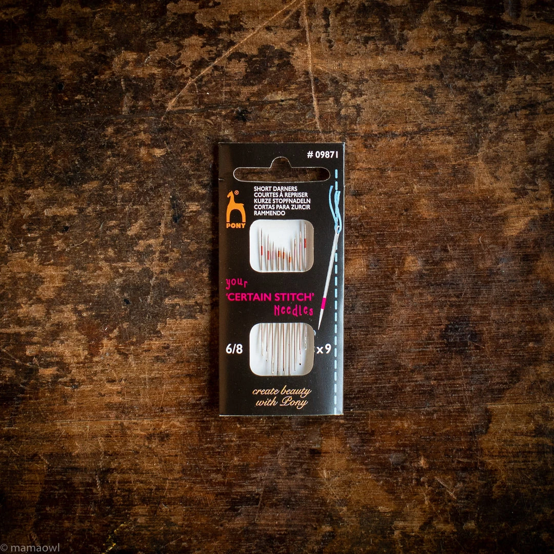 Hand Sewing Needles/Short Darners: great for embroidery, home sewing, quilting, fashion and darning. They have been developed to give consistent stitches. The needles feature a colour band on the shaft which helps to see how long the stitches should be to result in evenly spaced and consistent stitches. (With repeated use throughout tightly woven fabrics, this coloured marker may wear out but you can add it again with a little marker pen, nail varnish/enamel paint if needed).