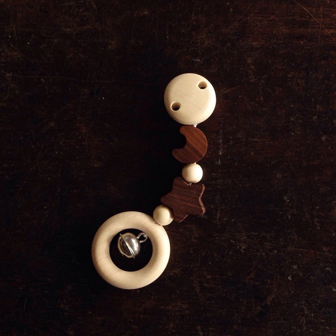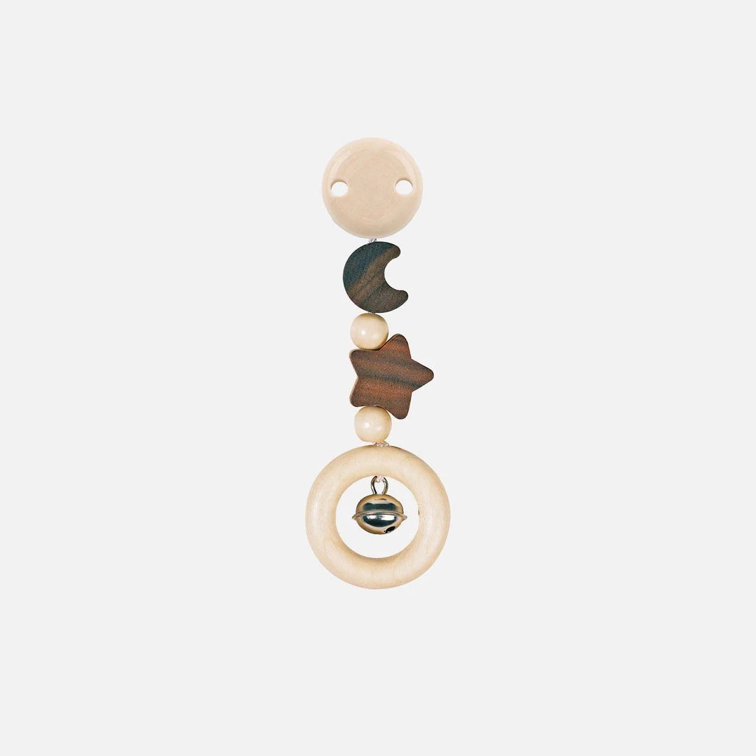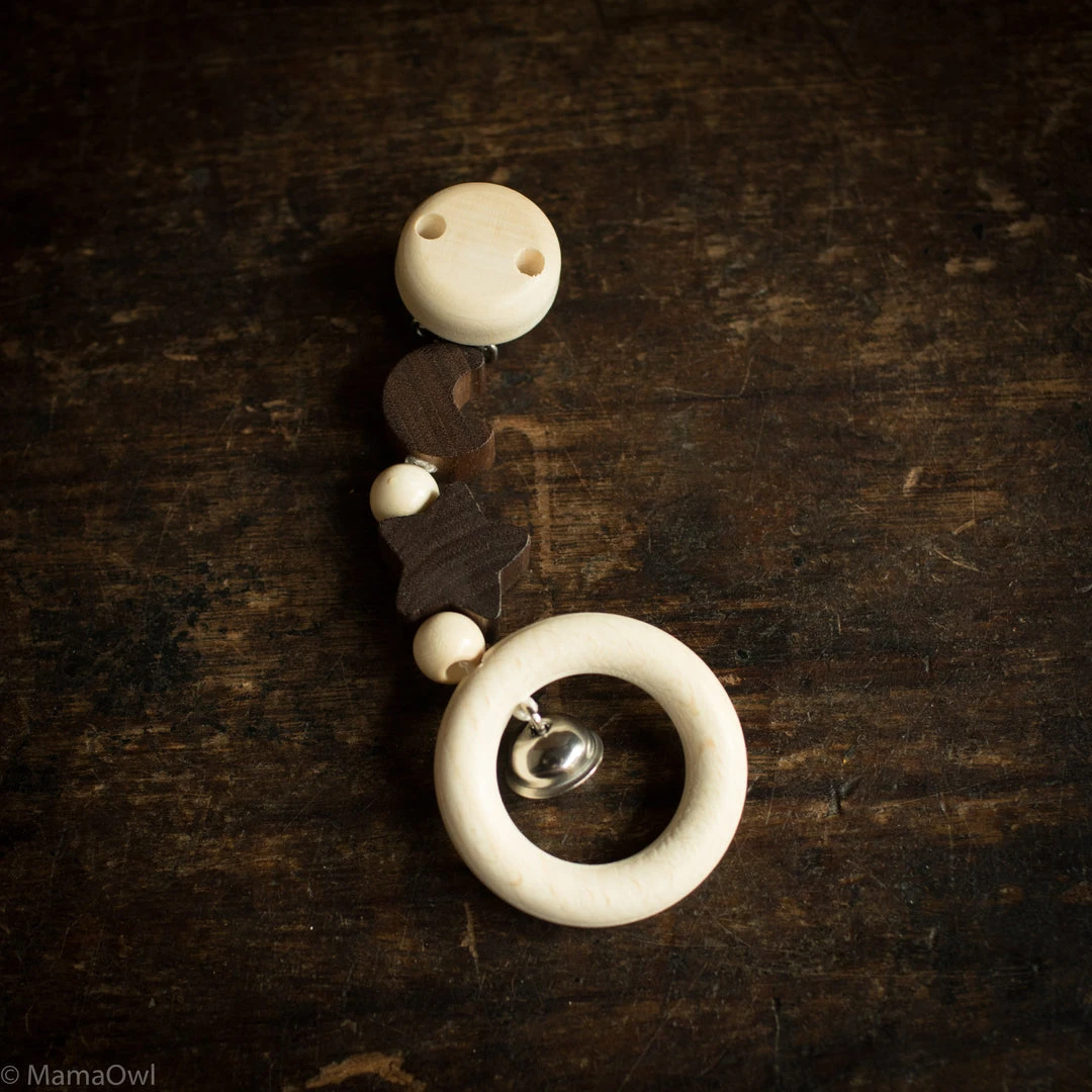 Beautiful wooden clip on mini mobile with a bell, perfect for stimulating and engaging your baby. With a clip it is easy to use in the pram, cot or anywhere else you feel. Made from sustainable European woods. 11cm.