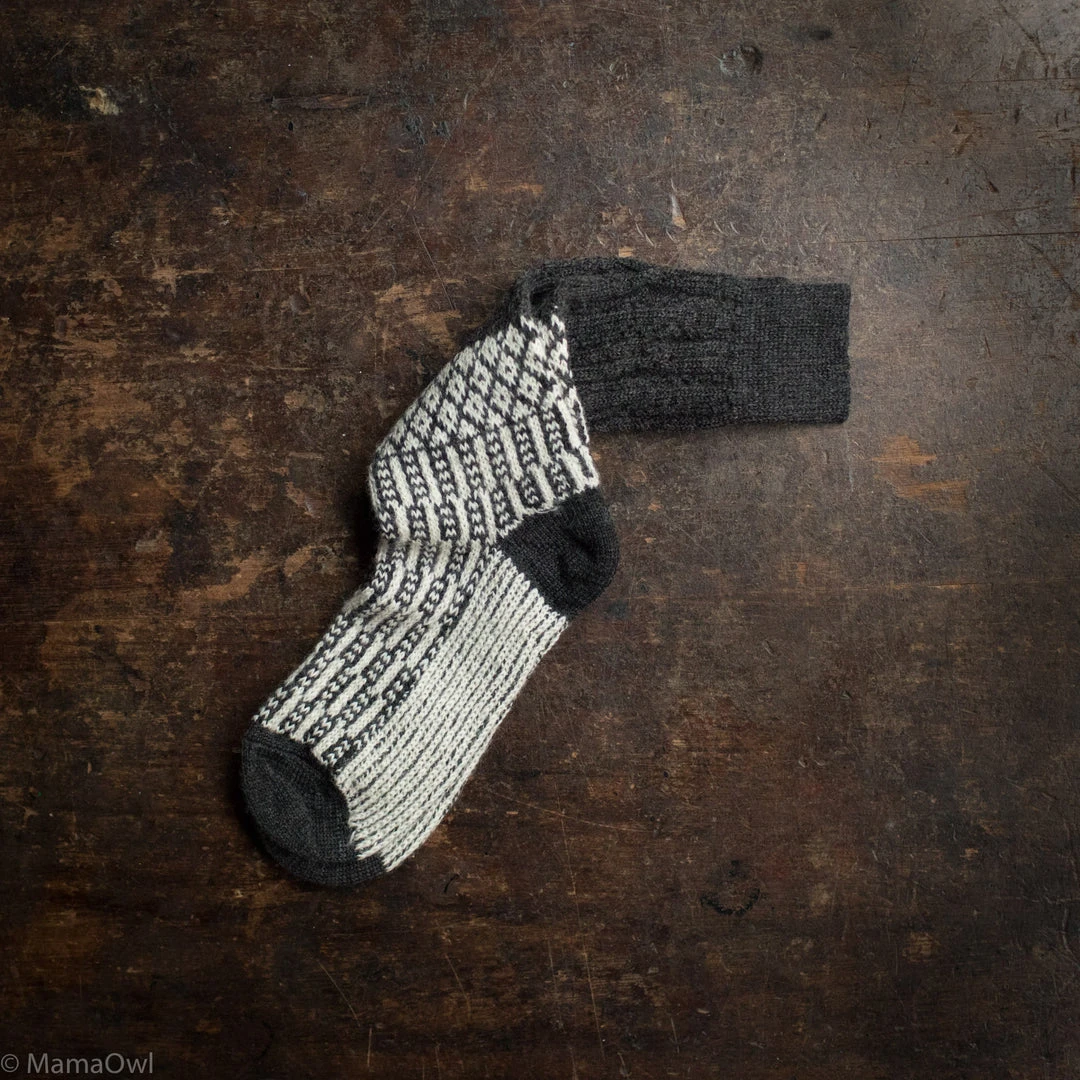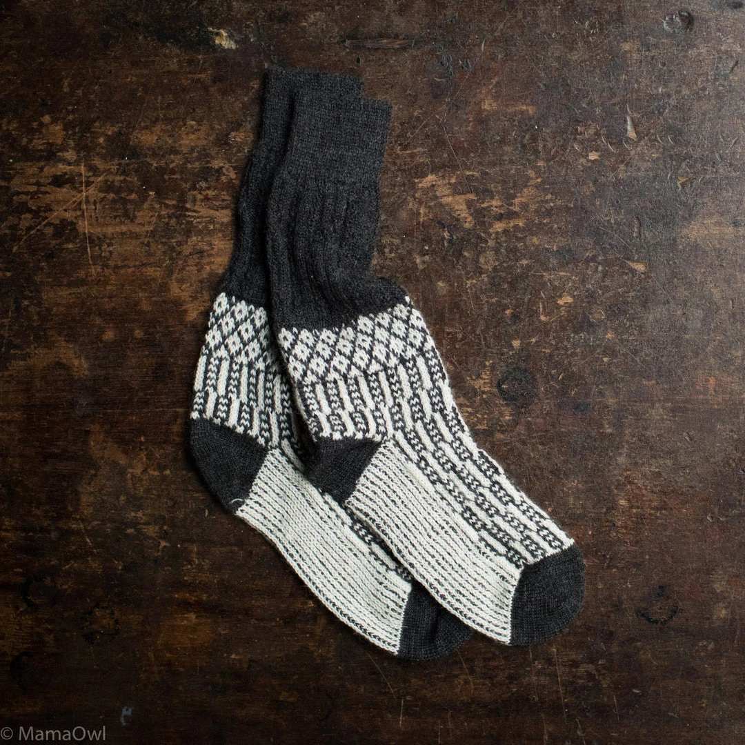 This sock is made using a classic Scandinavian pattern incorporating cable and Jacquard. It has a more fitted shaft that is very stretchy and works just as well rolled down or pulled up. This sock is great worn as a boot sock or for when something more substantial is needed throughout the colder months.Â