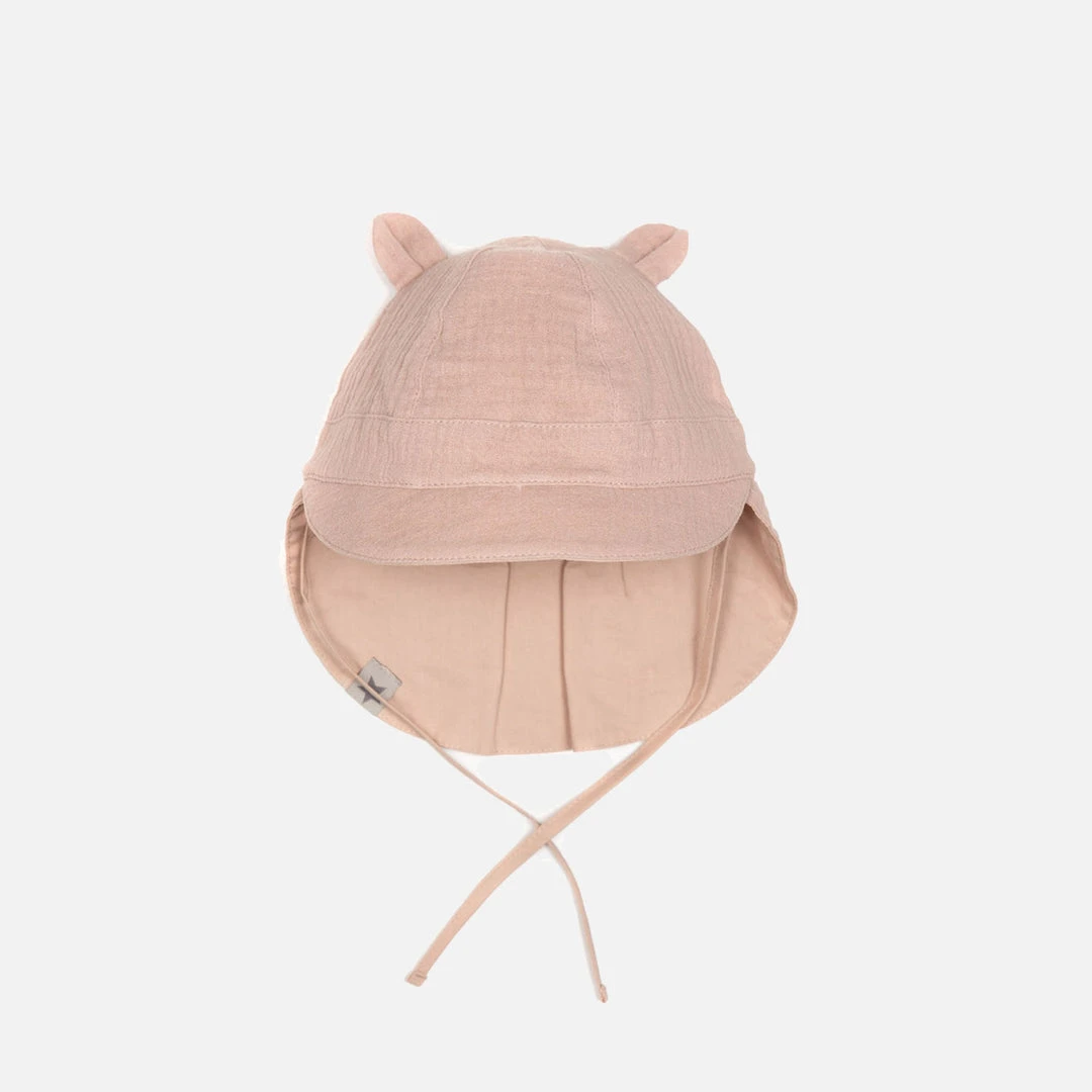 This is a perfect baby summer hat style. Featuring sweet little bear ears as well as the classic safari style cut with sun protection for the neck as well as the face. Made from a soft cotton muslin with a visor brim to shade the eyes, and ties to fasten under the chin.Â