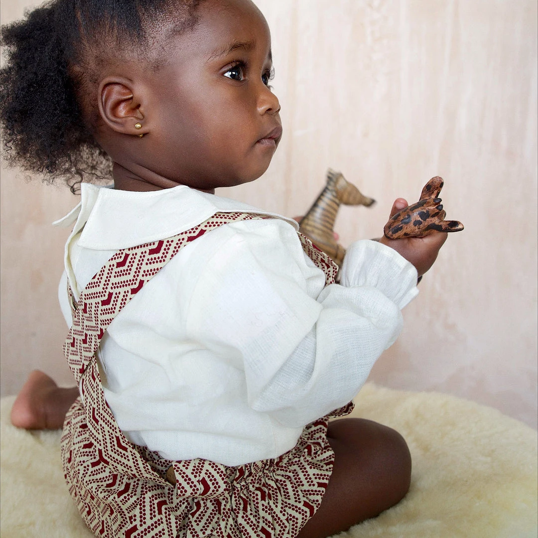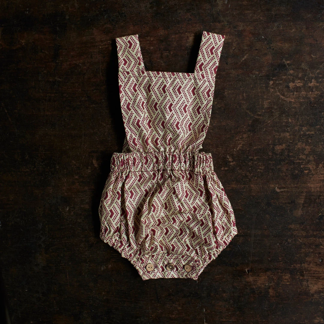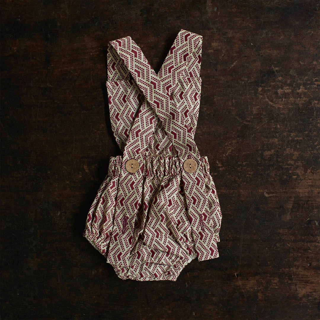 The Anwuli romper is a really sweet baby style. Made to fit newborn up to 2yrs. The classic bloomer style shorts have a a bib front with adjustable cross over straps that fasten at the back with coconut buttons.