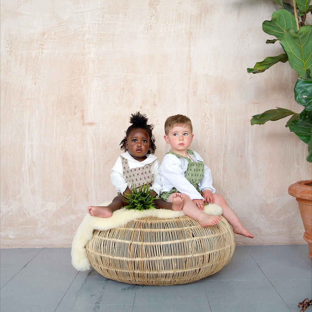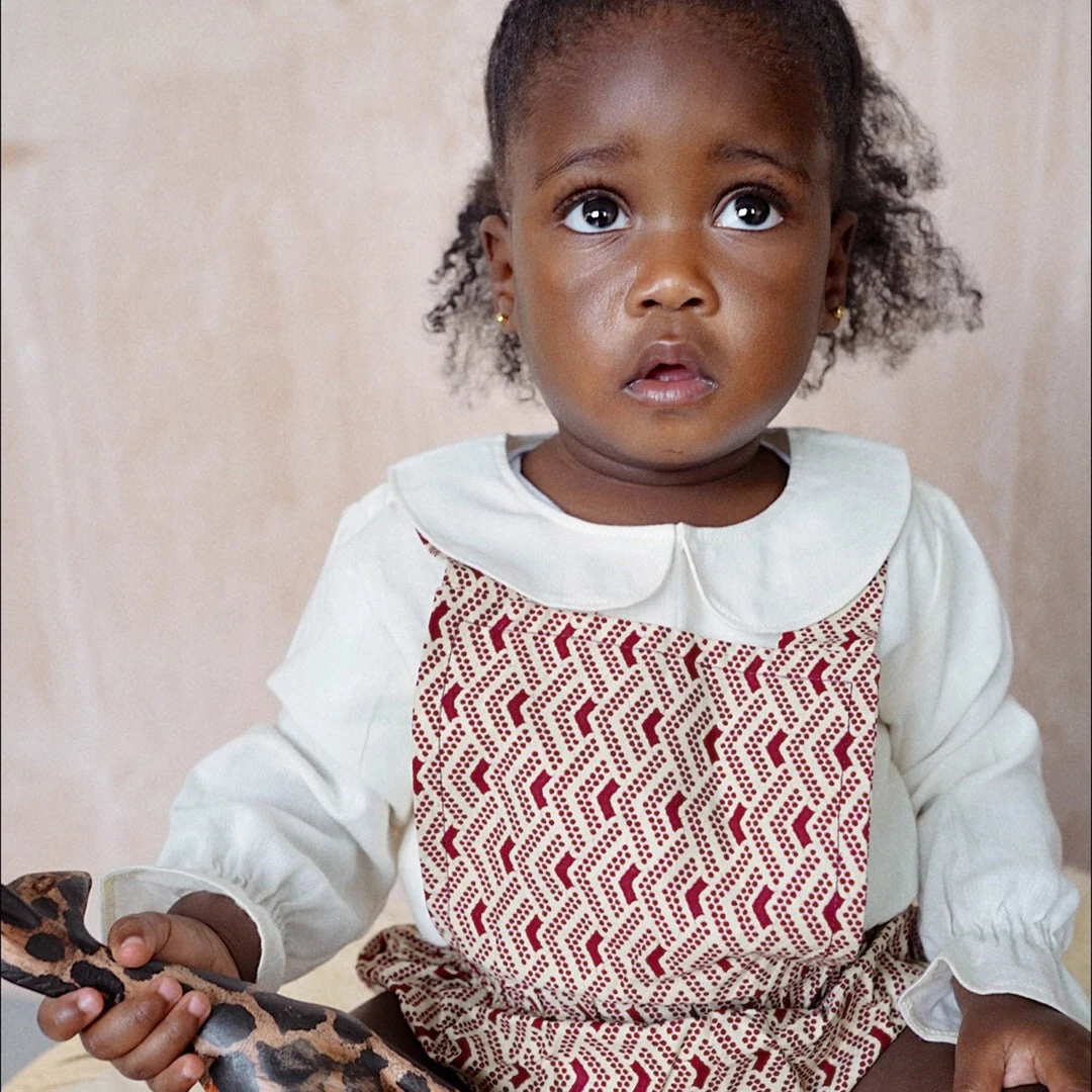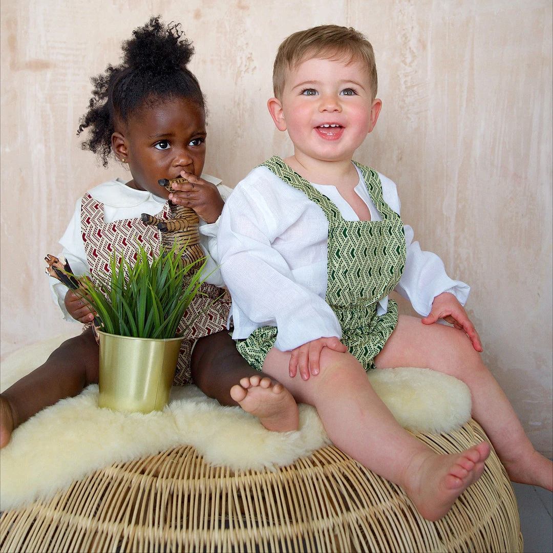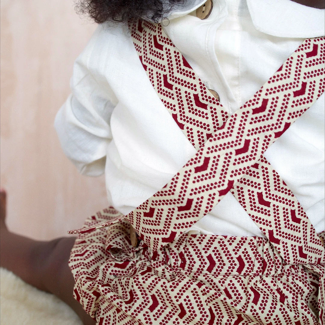 The Anwuli romper is a really sweet baby style. Made to fit newborn up to 2yrs. The classic bloomer style shorts have a a bib front with adjustable cross over straps that fasten at the back with coconut buttons.