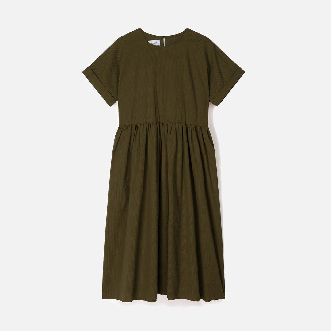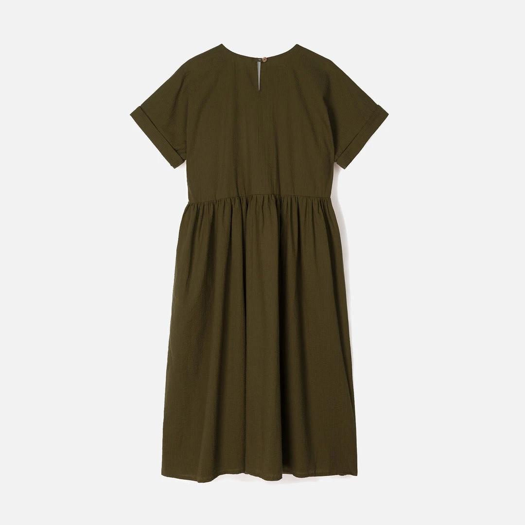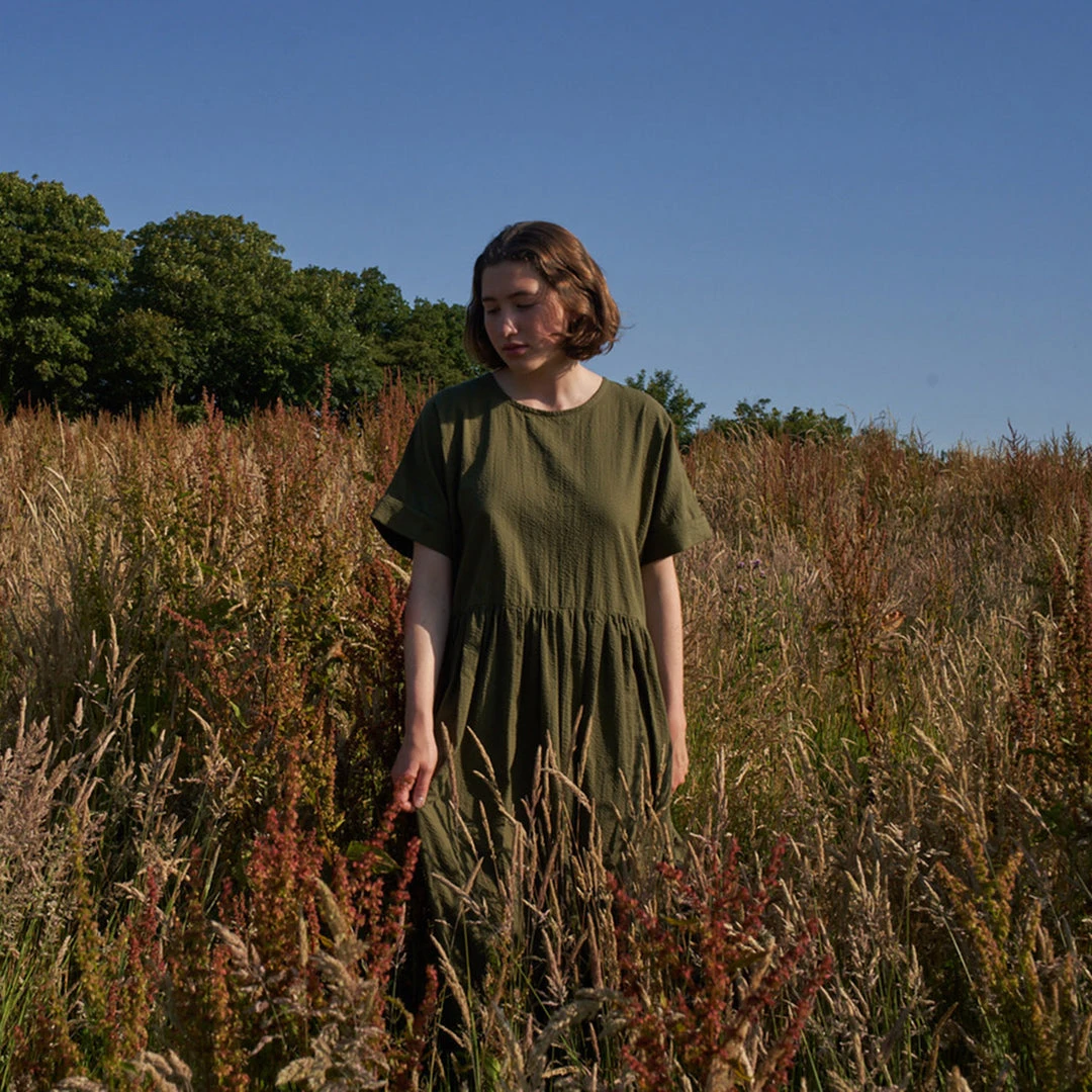 This is the Summer take on the popular flow dress from Kate Sheridan’s Winter collection. Super lightweight and airy, this dress has turned up sleeves, side pockets and a loop and button fastening at the centre back neck.