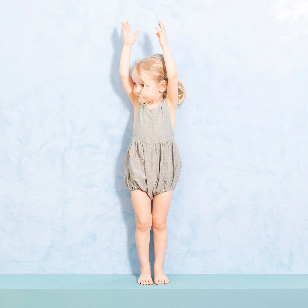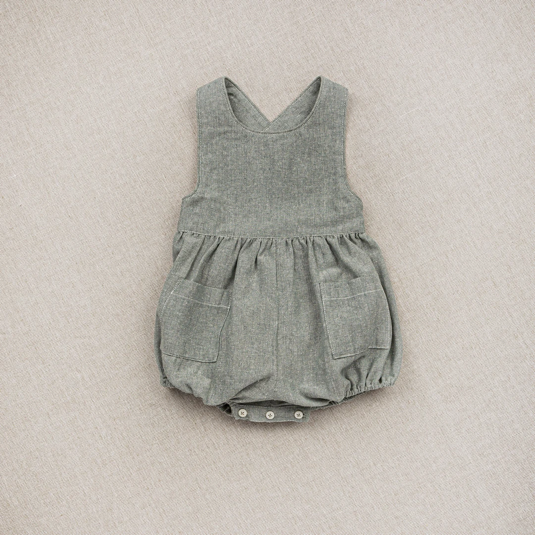 Sweet romper, perfect for summer. Designed with adjustable crossover straps and gathers under the waist. Easy changing with button fastening between the legs. Can be worn on its own on warmer days or with layers underneath when cooler. This romper is made from hand woven fabric.