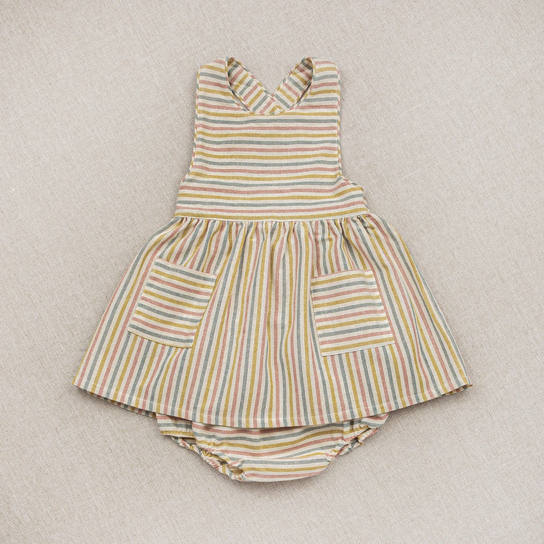 Apron style dress, open back with crossover straps, back elastic and gathered skirt with side pockets. This dress is are made from hand woven fabric.
