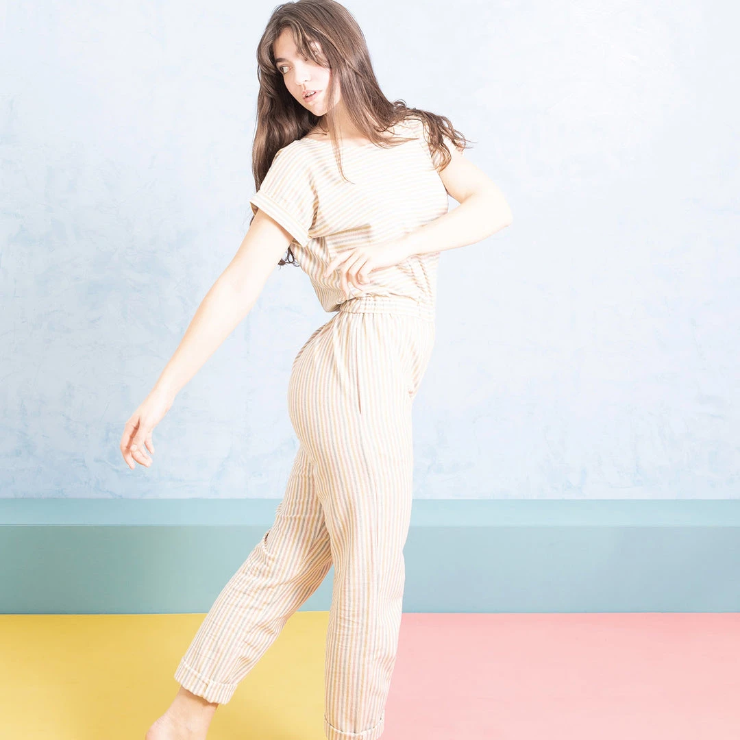 The popular Adele jumpsuit from last summer is back. An easy to wear jumpsuit with a high round neck at the front and an open wrap style back. Pockets at the sides for practicality. Super soft and comfortable for everyday wear, making it a summer essential. This beautiful hand woven fabric has the most wonderful mid weight and hand feel.