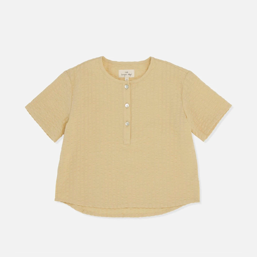 This classic short sleeved shirt is designed with a simple round neckline and mother of pearl buttons. Lightweight and perfect for summer.