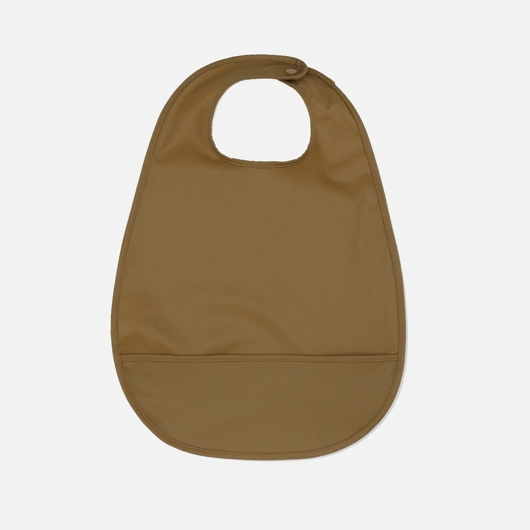This dinner bib comes in two colours, Dark honey and Toffee, both with an all over mini dot print. (not seen easily in the photo). The bib features a pocket to capture spills and escaping bites.