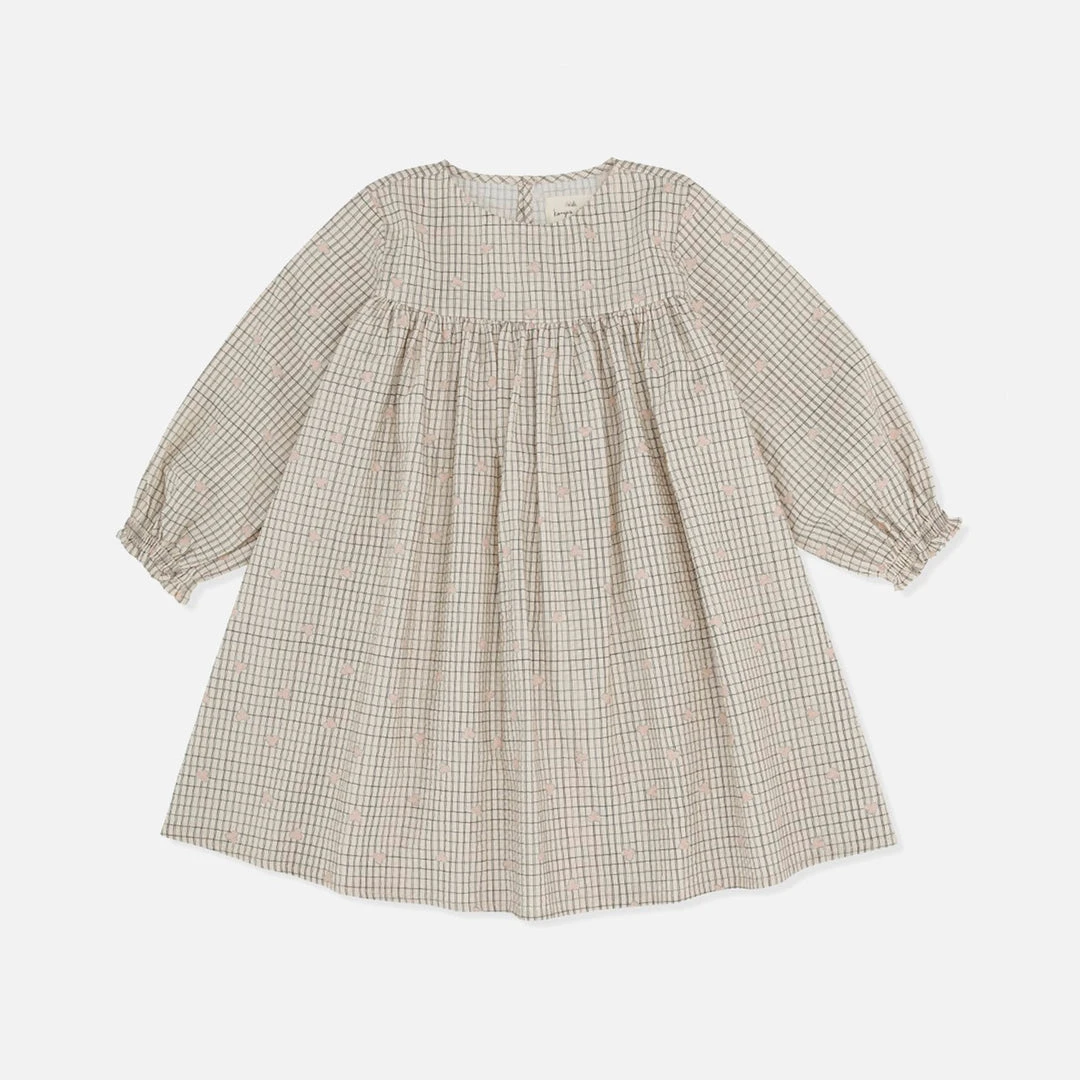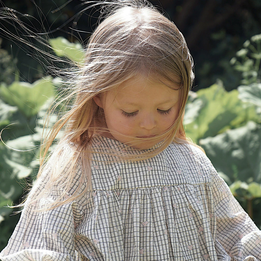 This dress is designed with a flared cut, elasticated frill cuffs and a single mother of pearl button fastening at the back neckline.