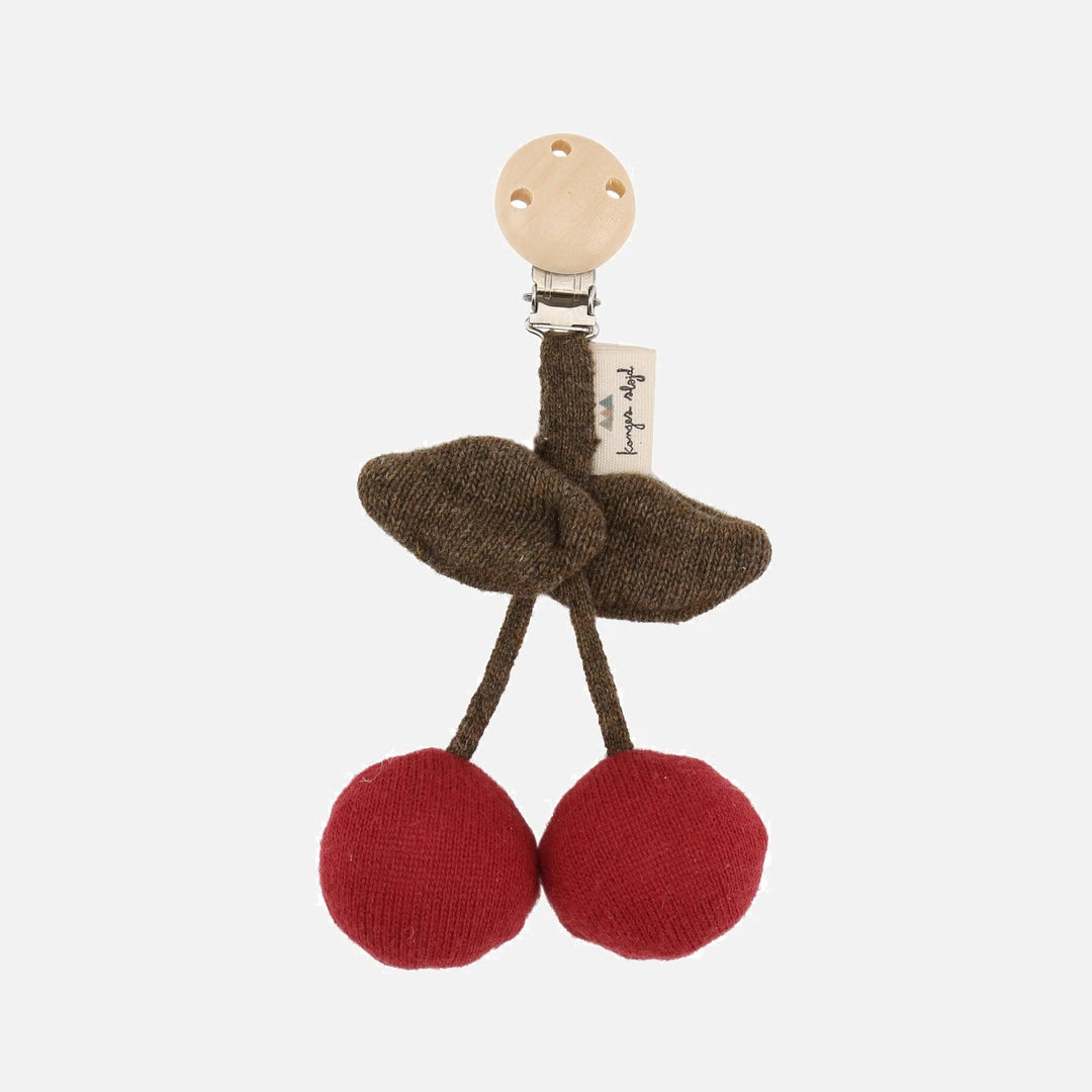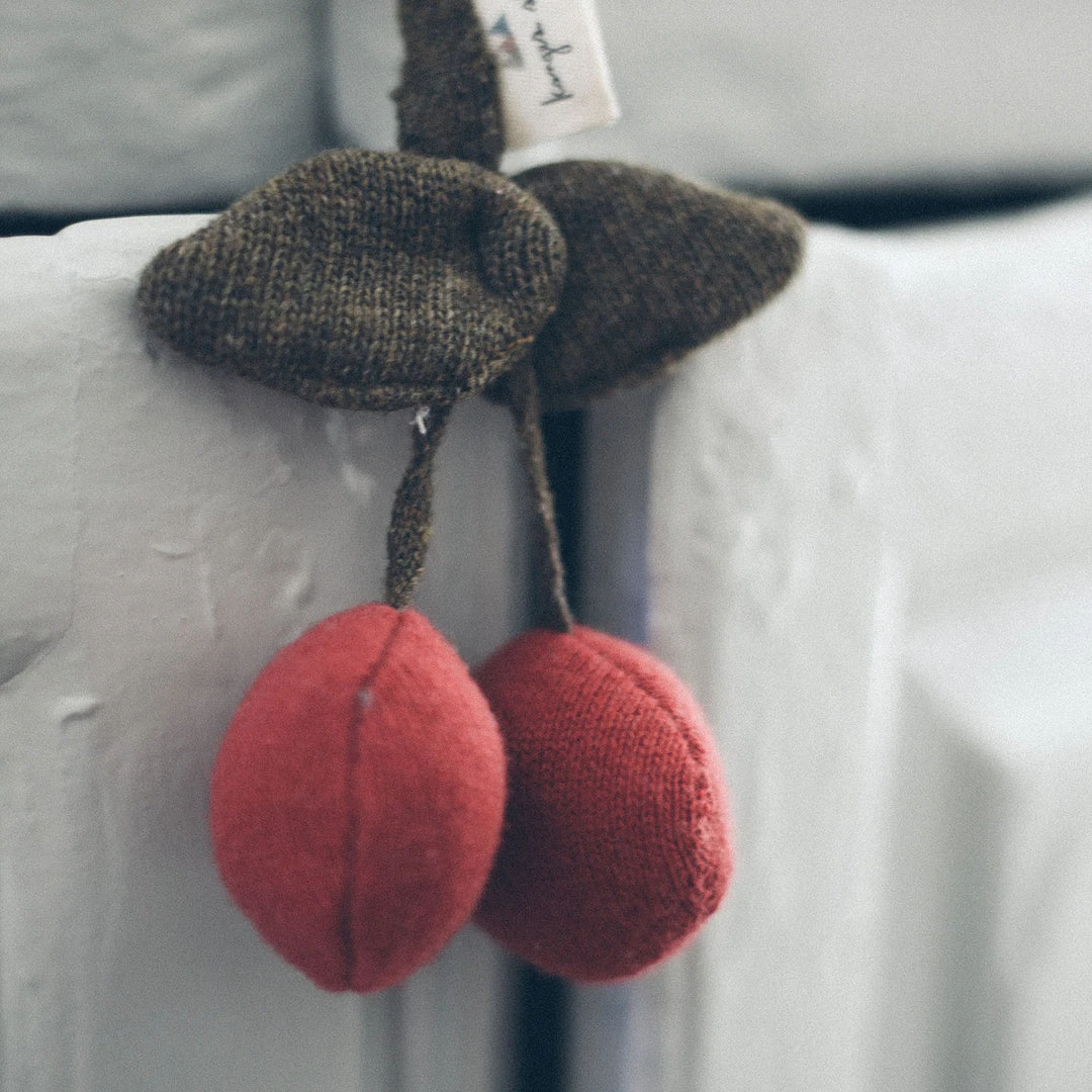 The raspberry has a fine knitted texture with a small bell inside and a wooden clip to dangle on the pram. Please keep out of reach of the baby. 100% lambswool.