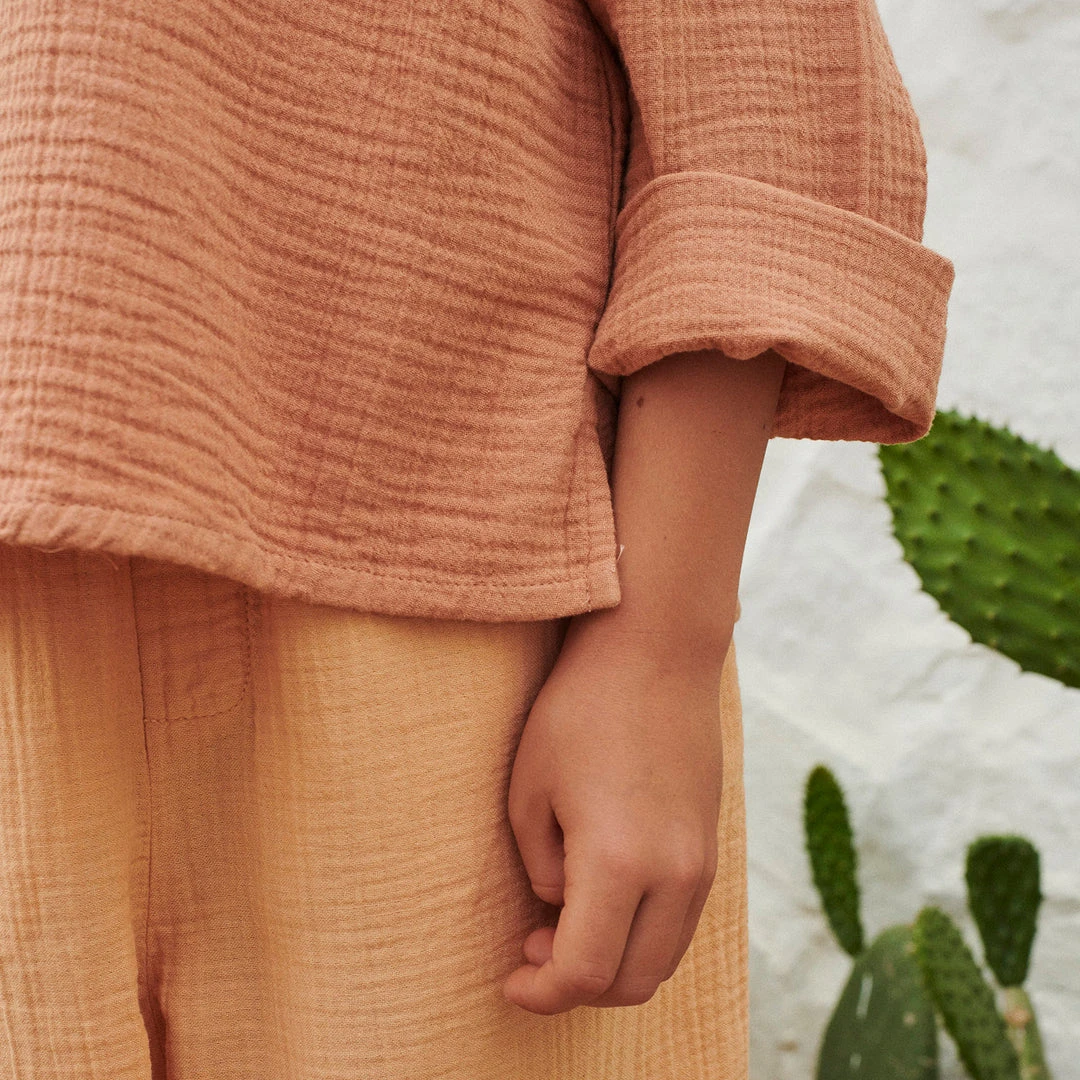 The Leonardo shirt is made from Liilu’s signature organic cotton muslin, super soft and easy to wear. Features v-neck detail at the front, easy to style with almost anything.