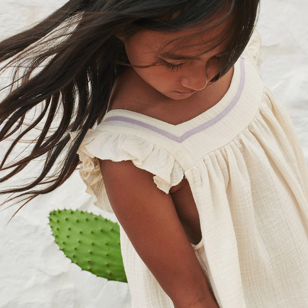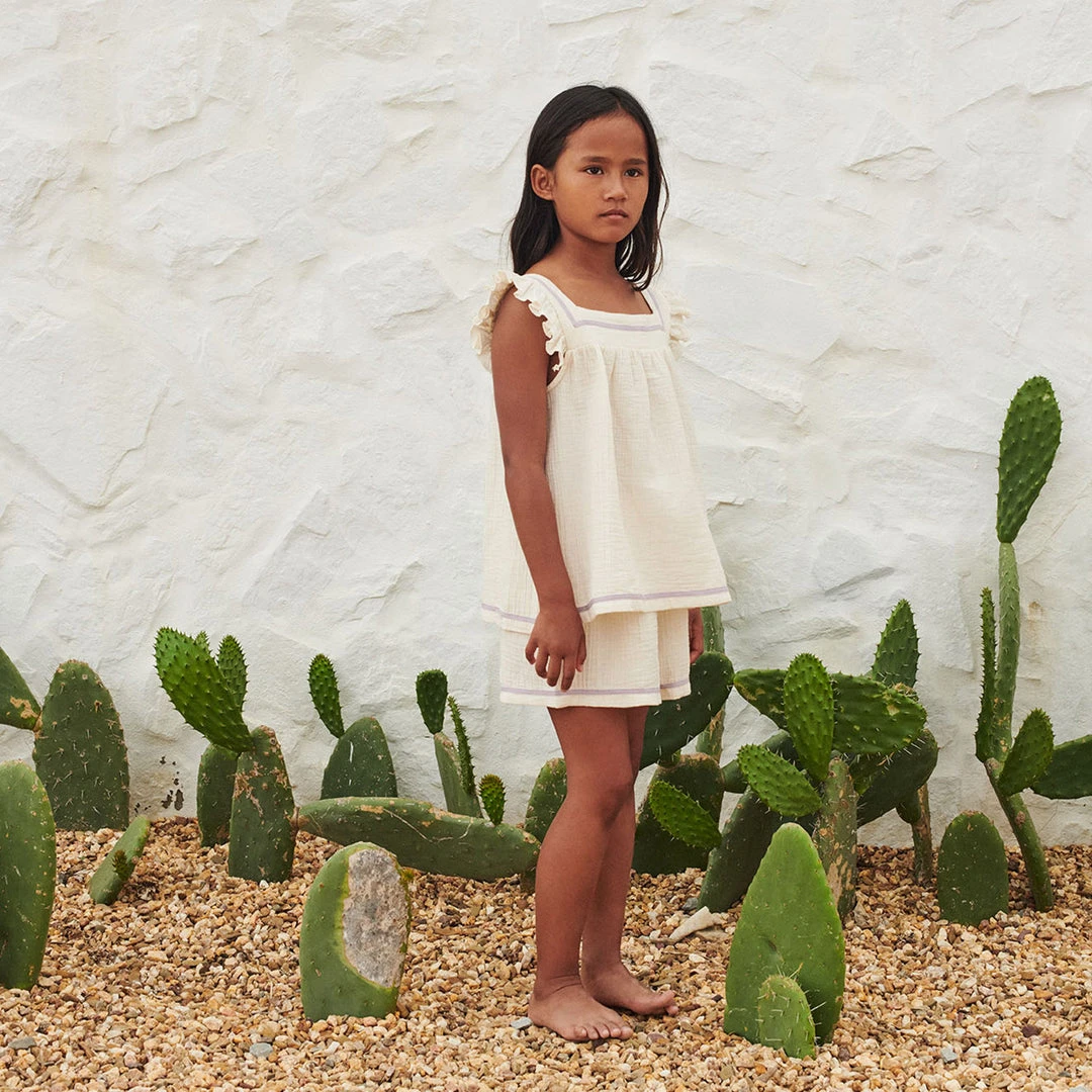 The Peppa pyjama is perfect for those warm summer nights. Designed sleeveless with ruffles and a comfortable fit, made in a cotton muslin. The Peppa pyjama is also available for women.Â
