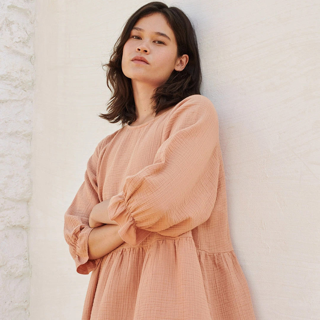 The Lilou dress has a versatile fit. Features sleeves with elastic at the end cuffs creating a sweet ruffle detail. Woven in soft organic cotton double muslin, perfect dress for summer.