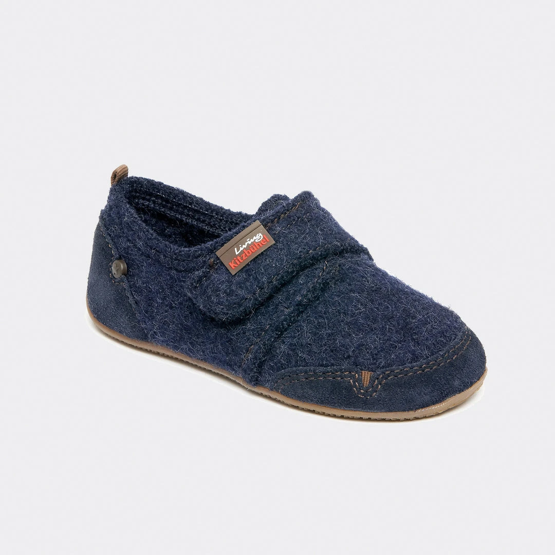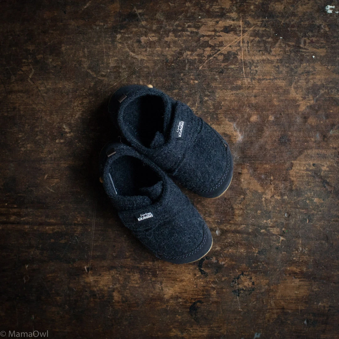 Navy Blue boiled wool slippers with reinforced leather heels and toes and flexible rubber soles for big kids, perfect for hard floors and lots of play, and sturdy enough to survive escapes out into the wild!