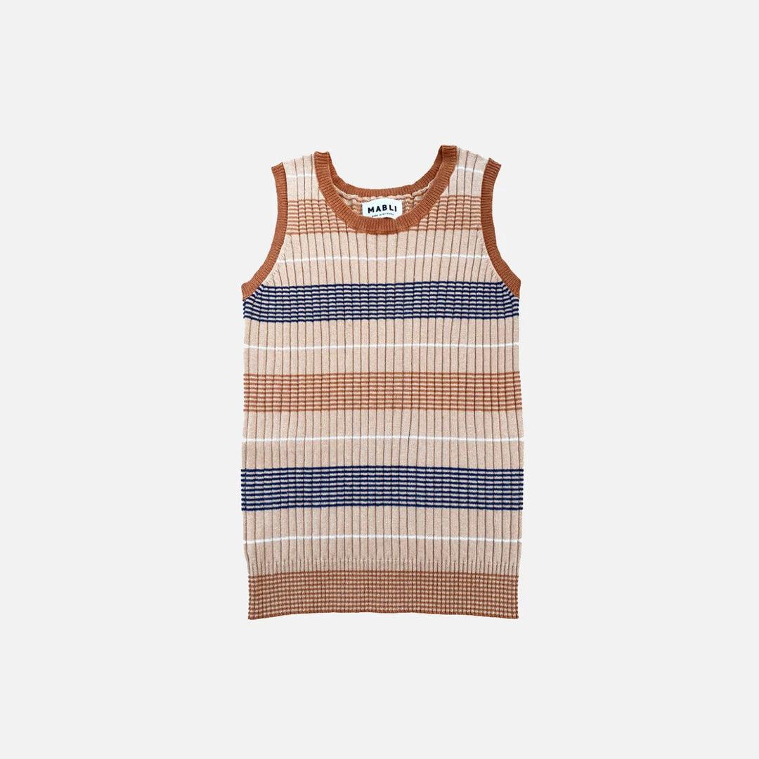 Sleeveless Deckchair top with contrasting hems. Knitted in a soft rib and features stripes.