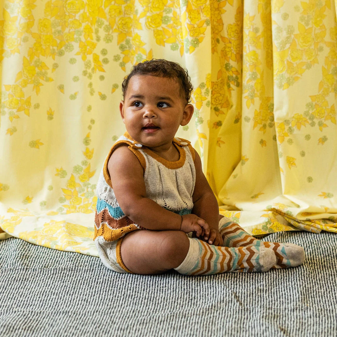 Lightweight romper featuring a knitted zig zag pattern across the middle. Designed with a button on each shoulder and between the legs for easy dressing.