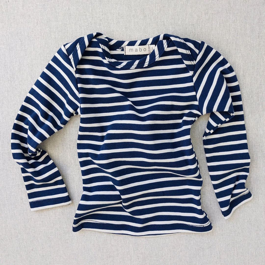 The long sleeved Striped Tee is one of Mabo’s most popular items. It is designed with a perfect fit and in the softest organic cotton. This long sleeved tee is perfect for all year around and its signature feature is the envelope style neck.